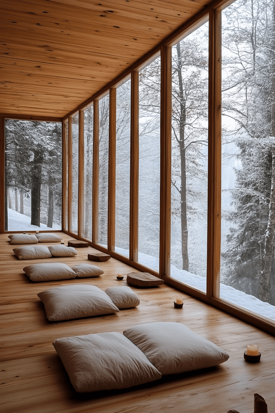 This peaceful meditation space expresses alpine interior design through soothing simplicity and natural balance. Low seating, natural materials, and uncluttered styling create a calm environment for relaxation. A window view of snowy peaks enhances the tranquil mountain ambiance. Soft cushions and warm earthy tones invite moments of quiet reflection. The design feels grounding, restorative, and perfectly aligned with alpine interior design principles. Create your own peaceful retreat and discover more alpine interior design inspiration now.