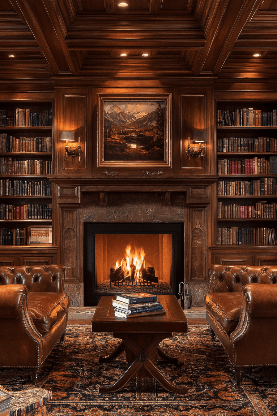 Book lovers will adore this cozy library where alpine interior design inspires every detail from wall to wall. Rich wood paneling and the glow of a fireplace create the perfect setting for peaceful afternoons with a favorite novel. A charming rolling ladder adds personality while making every shelf easy to explore. Plush seating and layered textures invite you to settle in and stay awhile. Surrounded by natural finishes, the room feels both elegant and incredibly comforting. Discover how alpine interior design can elevate your own reading retreat and start designing your dream library today.