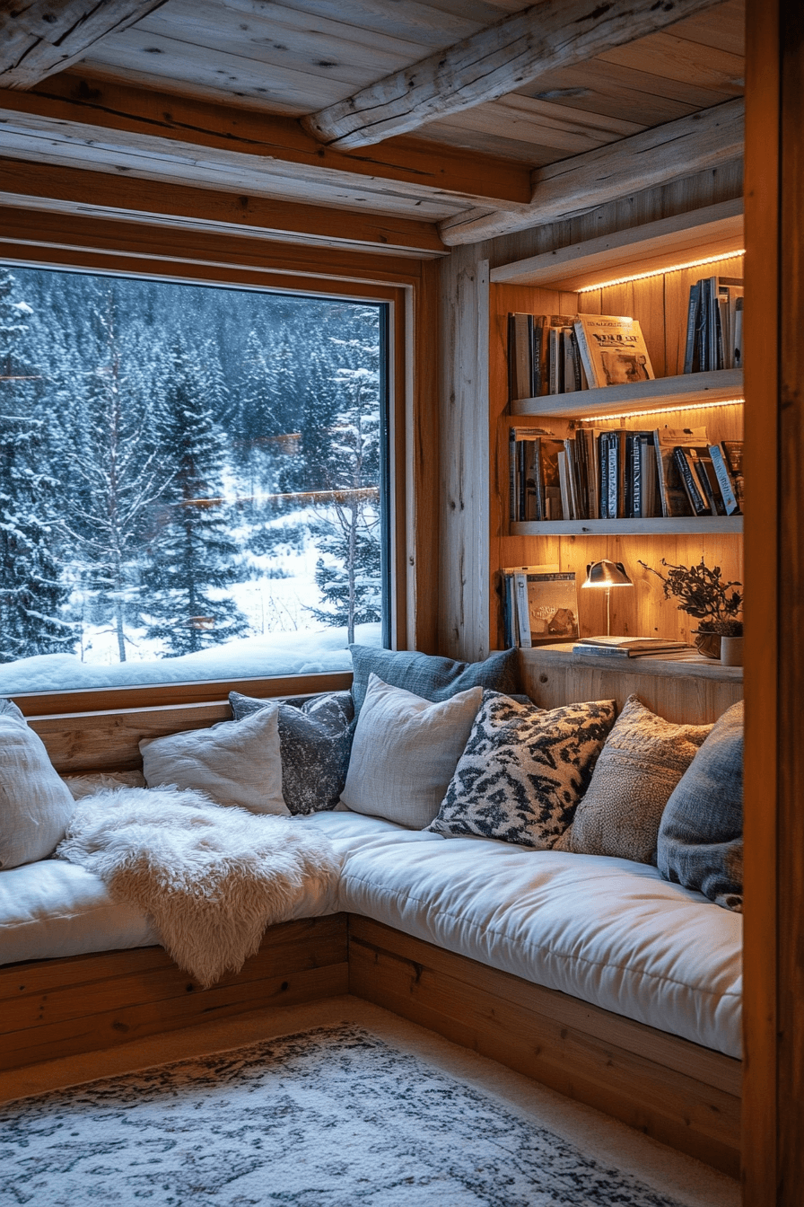 Nestled into a quiet corner, this delightful nook captures the warmth and charm of alpine interior design beautifully. A soft window seat offers the perfect place to enjoy snowy views and peaceful moments. Stacks of books, chunky knit blankets, and gentle lighting create a cozy atmosphere that feels instantly calming. Natural wood accents bring mountain character while keeping the design simple and inviting. Even a small corner can radiate comfort with thoughtful alpine interior design touches. Explore more alpine interior design reading nook inspiration and build your perfect cozy corner now.