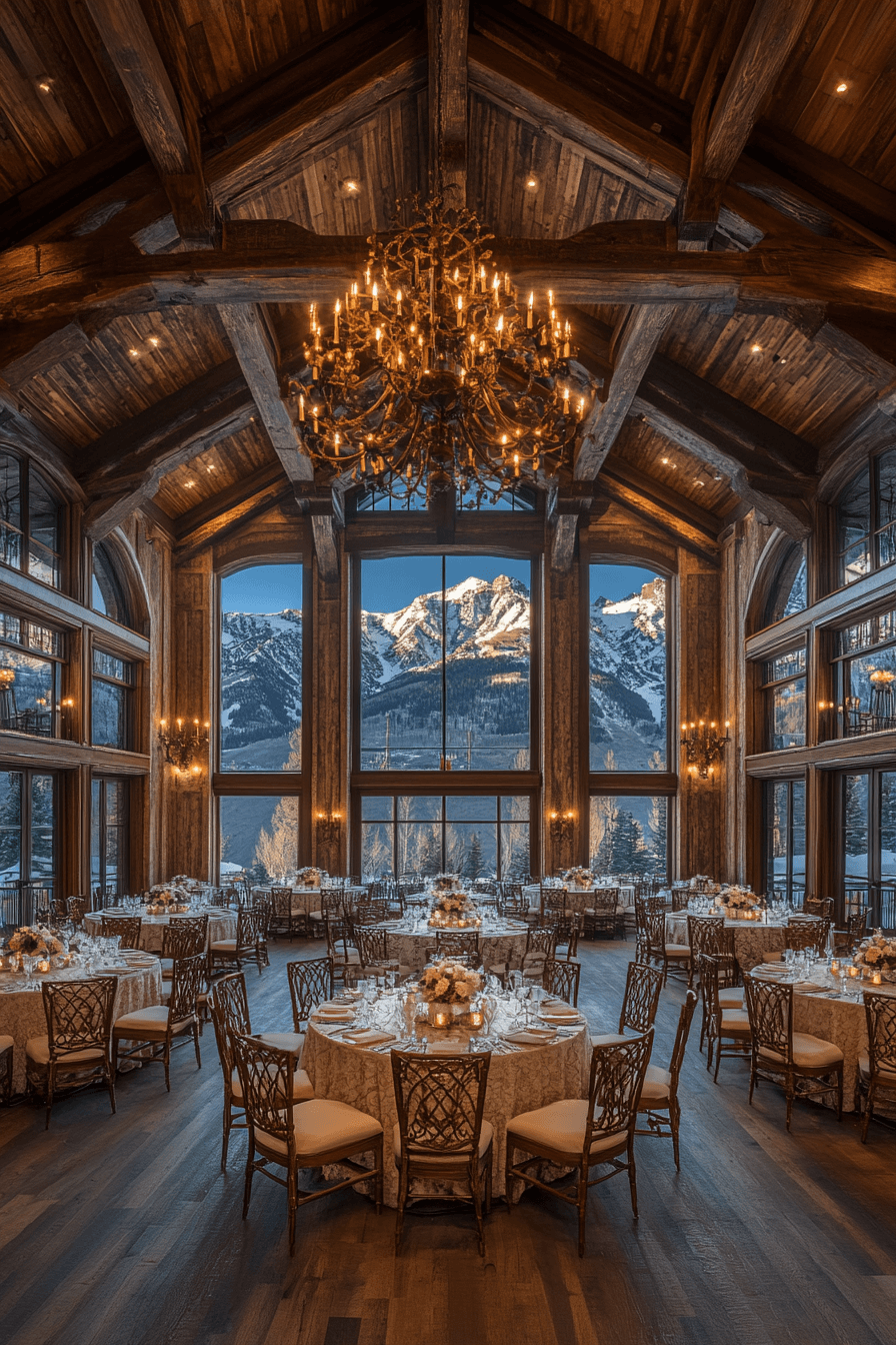 Elegant yet welcoming, this magnificent ballroom reimagines alpine interior design on a grand scale. Towering ceilings and exposed timber beams create a dramatic mountain-inspired backdrop. Sparkling chandeliers and plush seating add a luxurious touch while maintaining the warmth of natural materials. Rich textures layer beautifully throughout the space to create a celebratory atmosphere. The entire setting feels magical, inviting, and unforgettable. Bring alpine interior design into your own event space and start planning something truly spectacular.