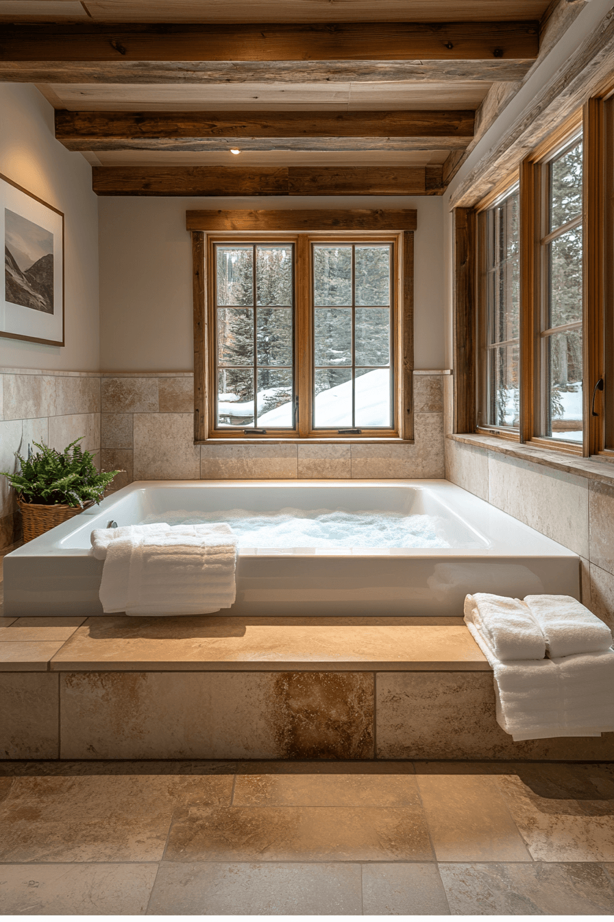 This tranquil spa retreat showcases the soothing beauty of alpine interior design in every detail. A deep soaking tub positioned near sweeping mountain views creates a relaxing focal point. Heated marble floors and soft lighting bring indulgent comfort to the entire room. Natural stone and wood elements add warmth while grounding the space in nature. Plush towels and calming textures transform everyday routines into spa-like moments. Refresh your home with alpine interior design inspiration and create your own luxurious escape.