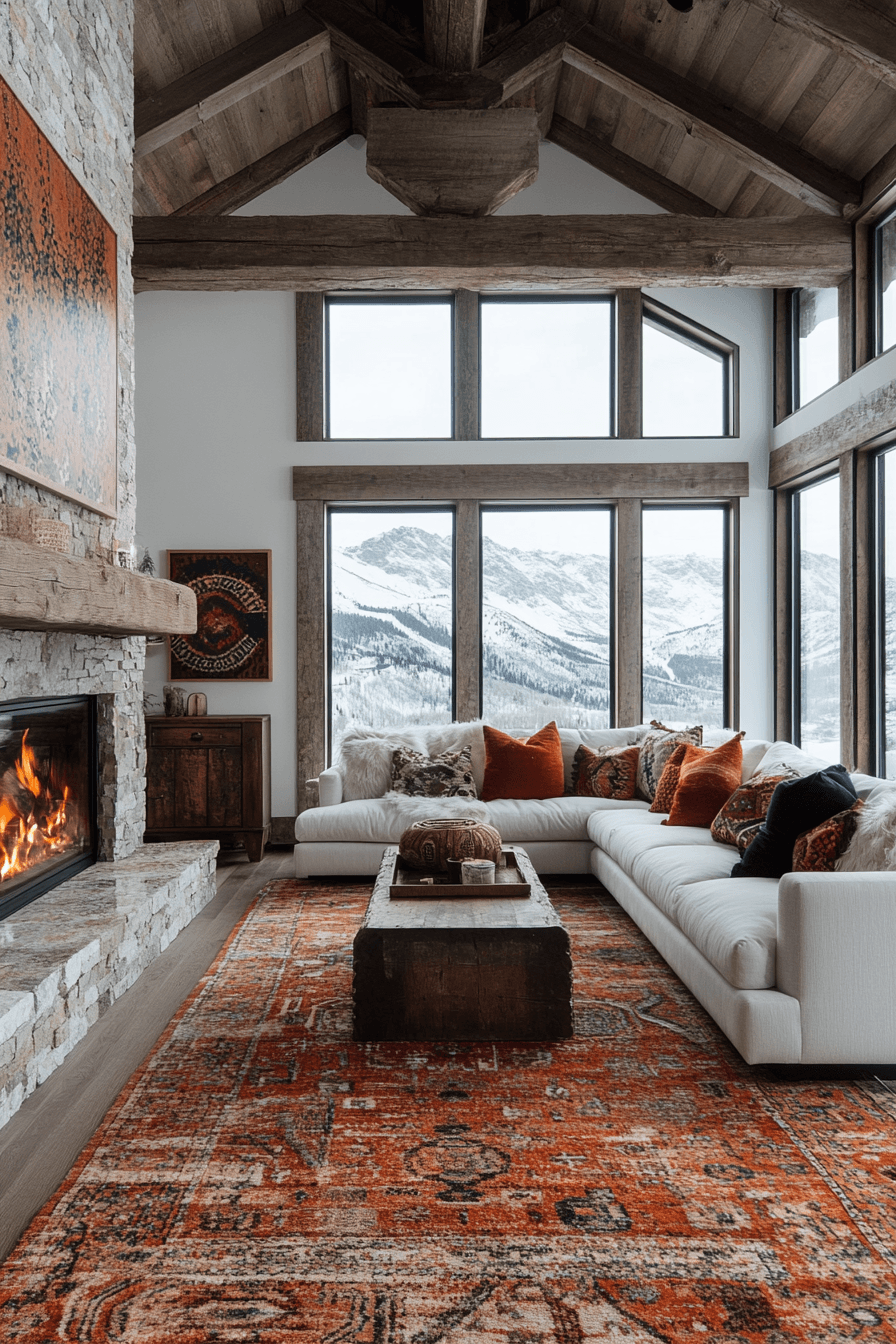 This eclectic living space celebrates alpine interior design while incorporating global influences. Rich fabrics, handcrafted accents, and natural materials create a layered and welcoming environment. The mix of worldly textures and mountain warmth feels unique yet harmonious. Every detail adds character while maintaining a cozy atmosphere. The space feels adventurous, inviting, and beautifully grounded. Reimagine your living room with alpine interior design ideas and start crafting your own inspiring interior today.