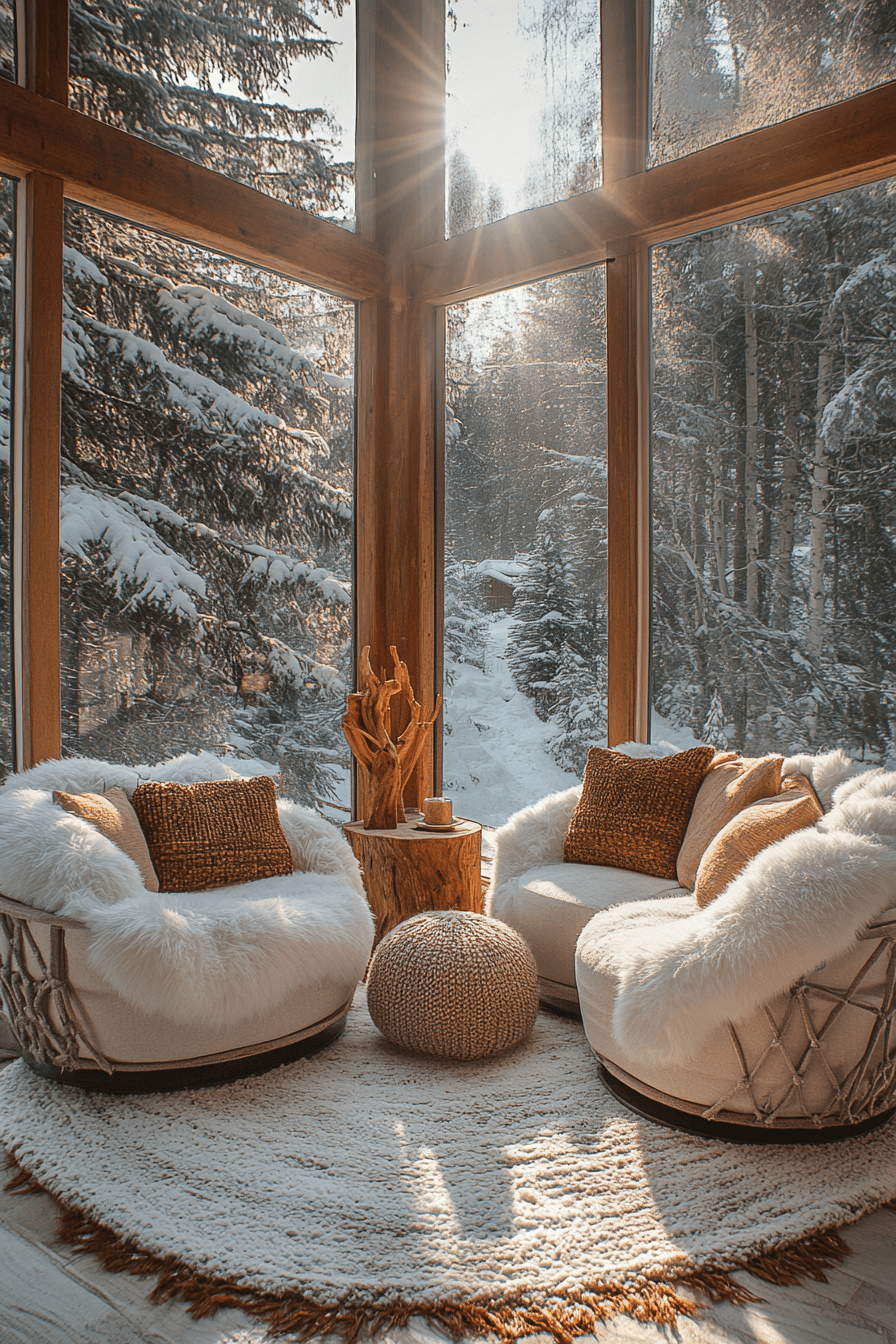 Filled with natural light, this cheerful sunroom highlights the uplifting beauty of alpine interior design. Wide windows frame snowy mountain landscapes that feel like living artwork. Exposed beams and warm textiles provide comforting contrast to the crisp outdoor scenery. A small glowing stove adds cozy charm during chilly mornings. Neutral tones and simple furnishings keep the focus on the stunning views outside. Bring alpine interior design into your sunroom and create a peaceful space to soak in the scenery.