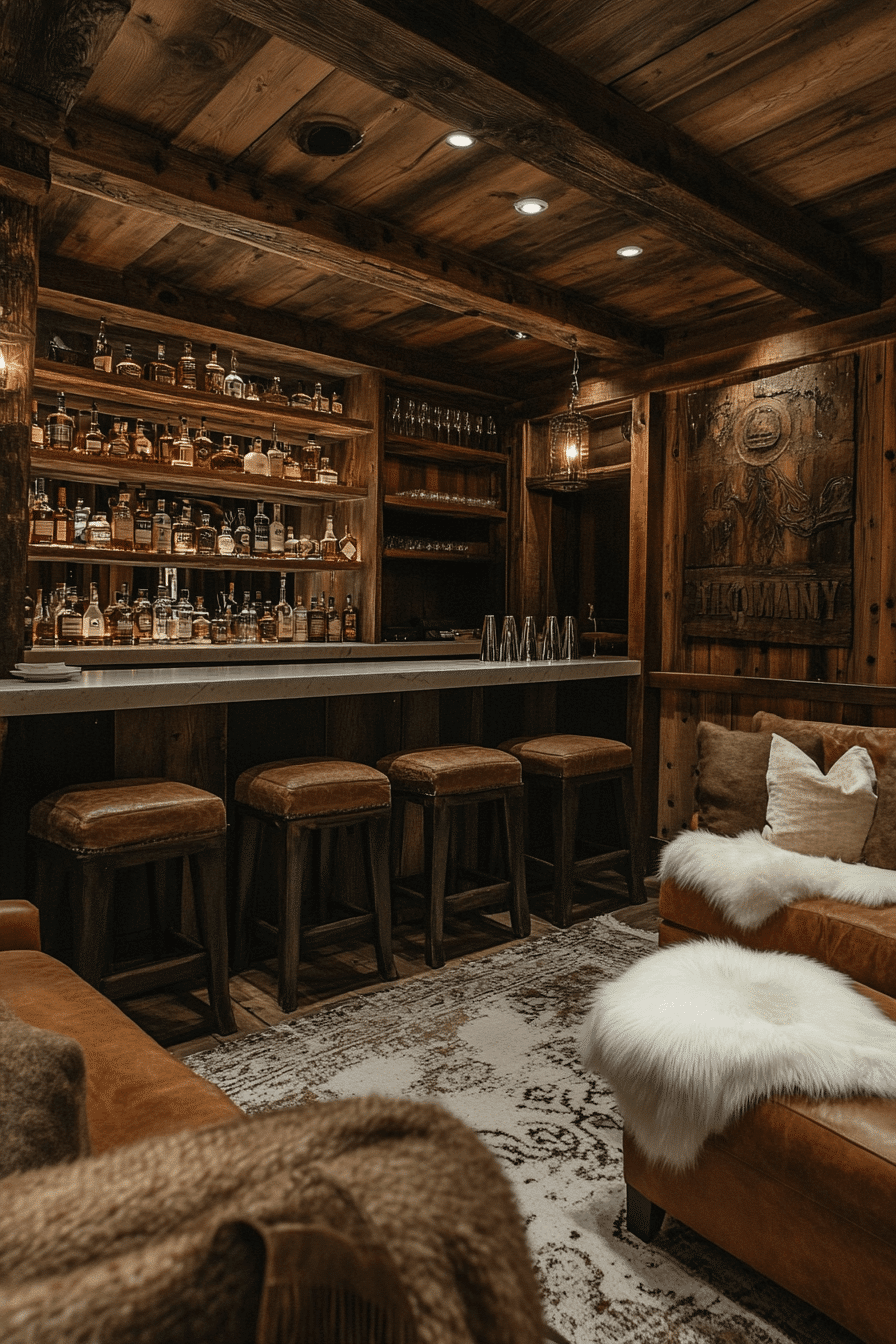 This cozy evening lounge reflects the relaxing charm of alpine interior design with effortless sophistication. Supple leather chairs, layered blankets, and a small bar corner create the perfect setting for quiet gatherings. Warm lighting glows against reclaimed wood finishes, filling the space with inviting ambiance. Rich textures add depth while maintaining the rustic elegance of mountain living. The room feels intimate, stylish, and wonderfully comfortable. Reimagine your evening relaxation with alpine interior design lounge inspiration and bring the mountain vibe home.