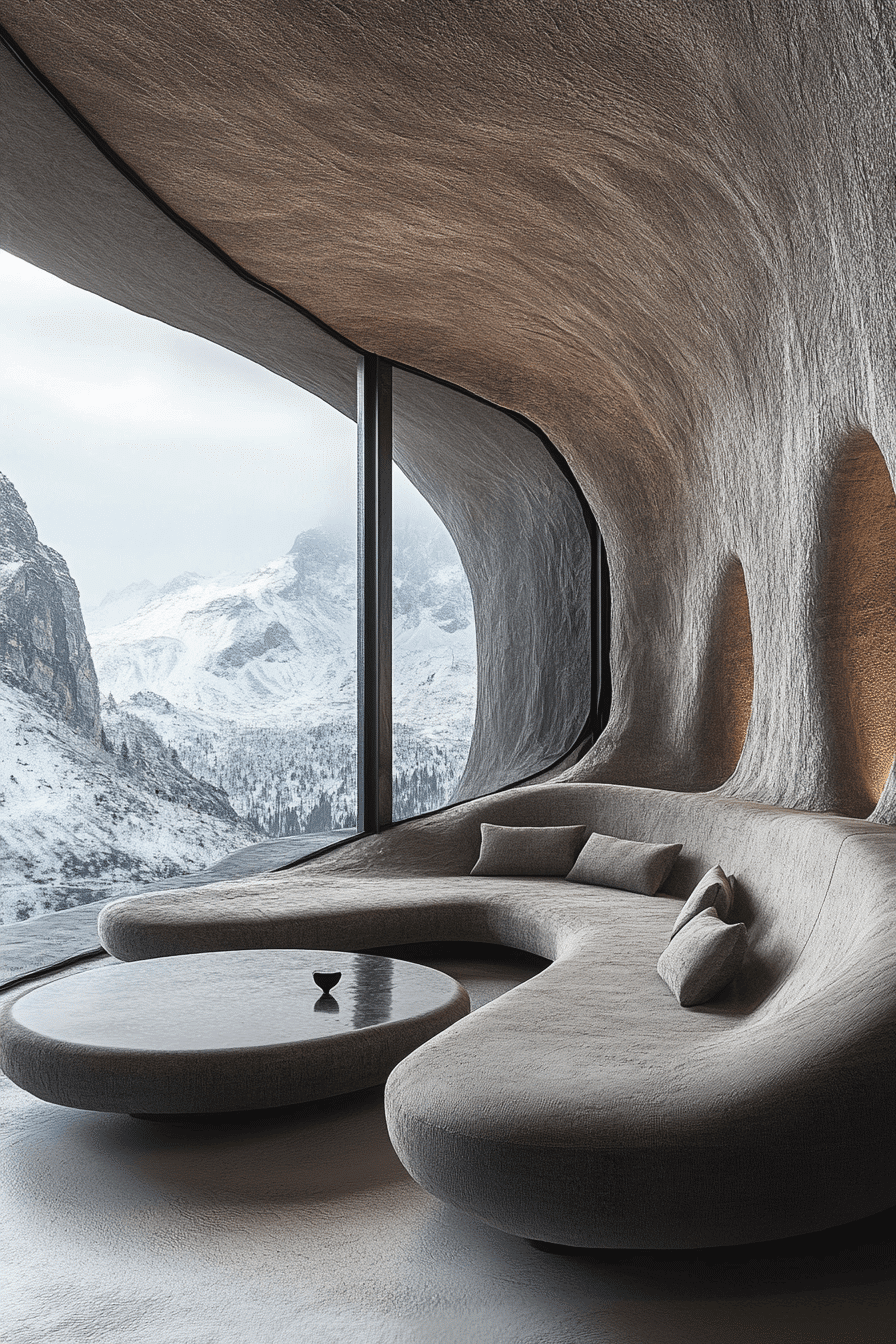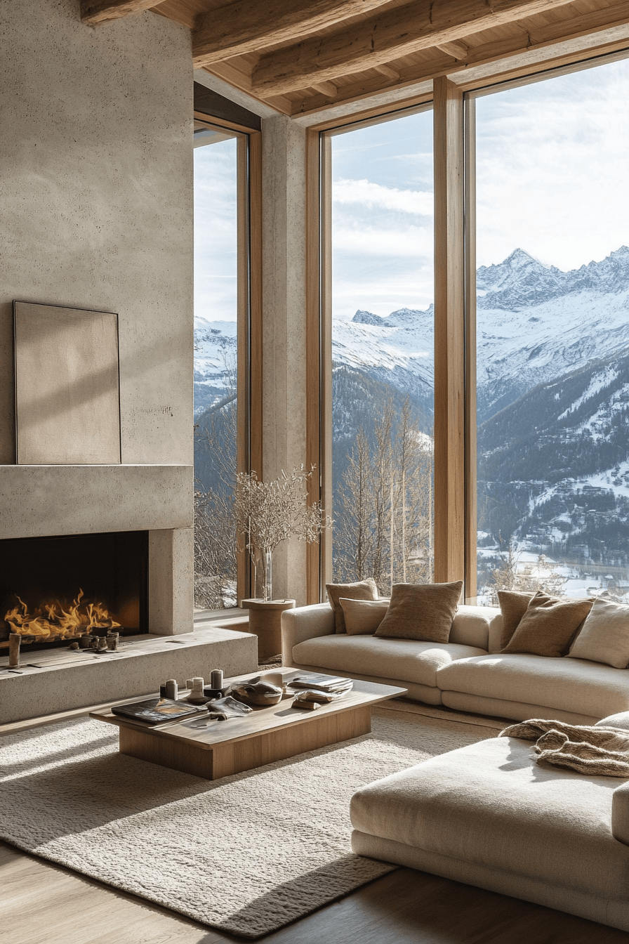 This modern mountain retreat beautifully reinterprets alpine interior design with sleek furnishings and stunning natural wood textures. Expansive floor-to-ceiling windows capture breathtaking mountain views, turning the scenery into living artwork. Natural materials and soft layered lighting create an uplifting atmosphere that feels warm and welcoming. Minimal styling keeps the room feeling open while letting every organic detail shine. The overall vibe blends contemporary elegance with the comforting spirit of alpine interior design. Discover how alpine interior design can transform your living space and get inspired today!