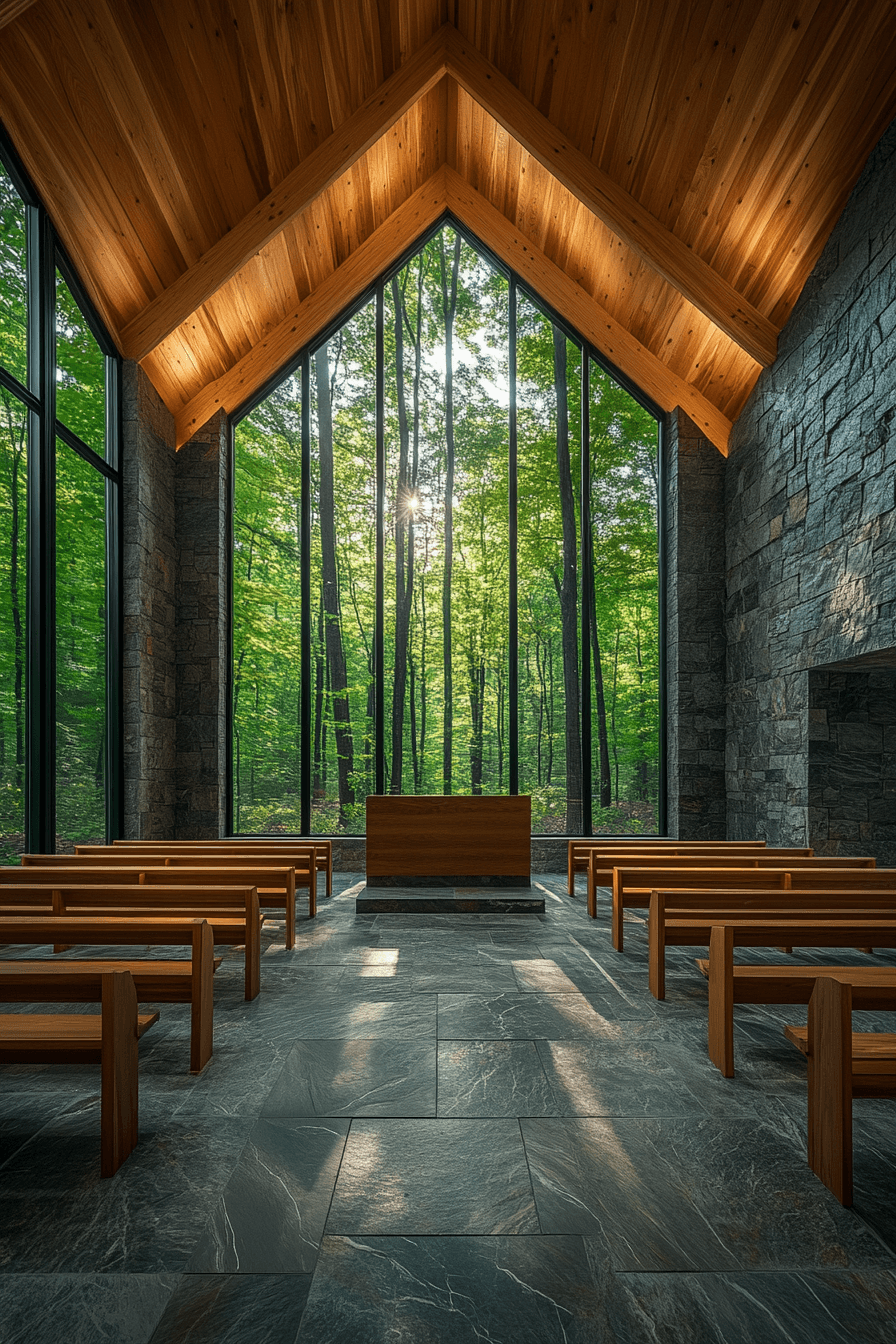 Peaceful and contemplative, this mountain chapel expresses alpine interior design through graceful simplicity. Handcrafted wooden benches and delicate stained glass add warmth and quiet elegance. Soft lighting highlights natural timber beams and textured stone details. Expansive windows reveal surrounding peaks, strengthening the sense of connection to nature. The atmosphere feels grounding, serene, and spiritually uplifting. Discover how alpine interior design can inspire your own tranquil space for reflection and calm.