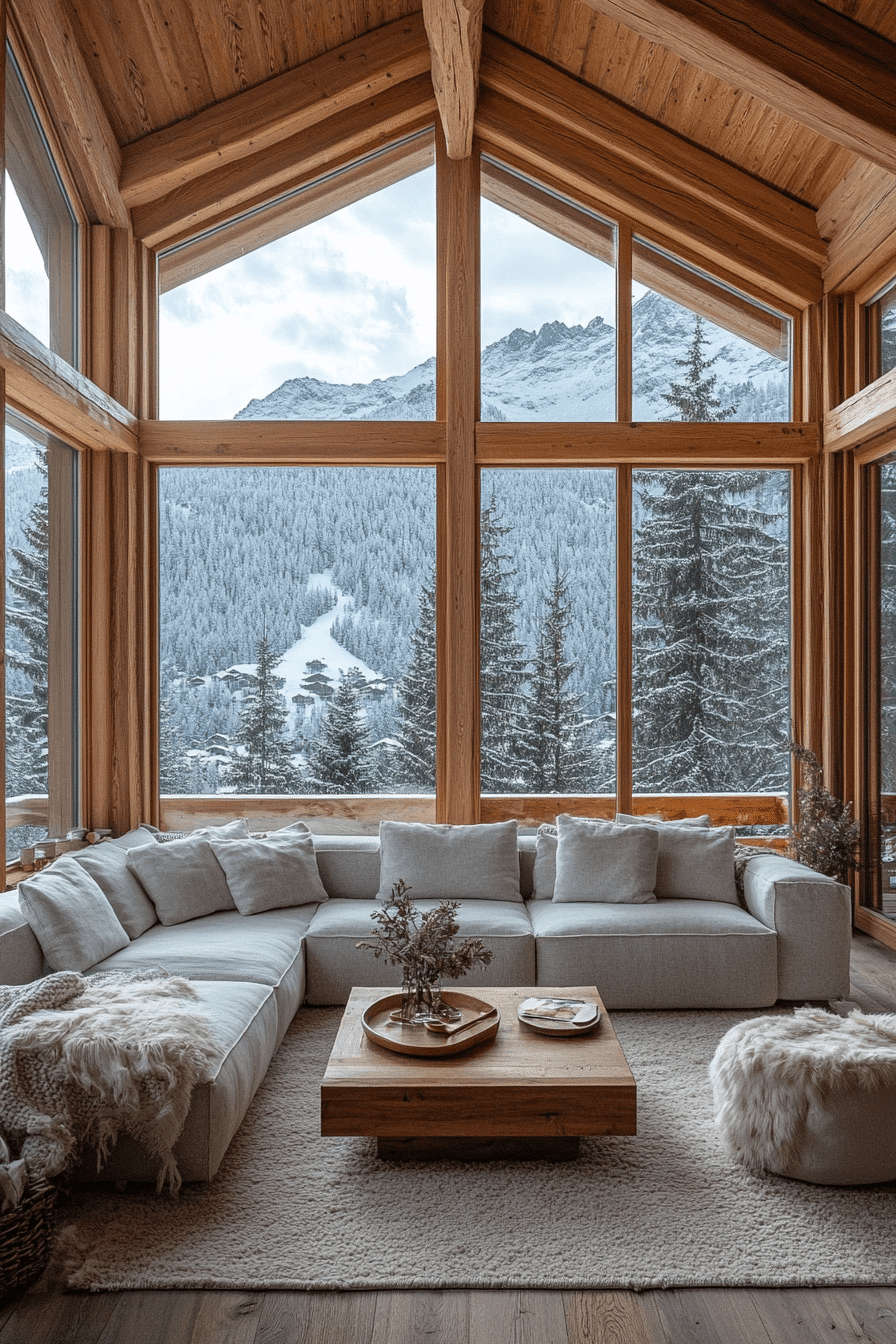 Surrounded by sweeping glass walls, this scenic retreat celebrates alpine interior design at its most breathtaking. Floor-to-ceiling windows frame spectacular mountain views while natural wood and wool textures complement the landscape. Low-profile furniture keeps sightlines open so the scenery remains the star of the room. Cozy throws and simple decor add warmth without distracting from nature’s beauty. The space feels expansive, uplifting, and deeply connected to the outdoors. Experience the magic of alpine interior design and start planning your own panoramic mountain sanctuary today.