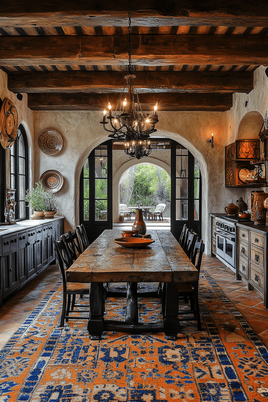Rich character and welcoming warmth shine through antique dining rooms designed with Spanish Revival influence. Textured plaster walls and beautifully carved wooden furniture bring depth and authenticity to the space. Wrought iron chandeliers and bold accents add rustic personality and charm. Arched architectural features frame the room with dramatic Mediterranean flair. These antique dining rooms feel lively, festive, and perfect for gathering loved ones around the table. Infuse your home with vibrant energy by exploring Spanish Revival antique dining rooms!