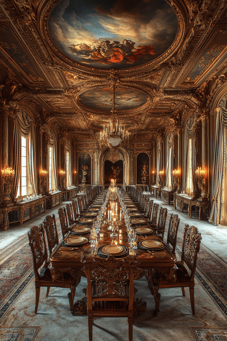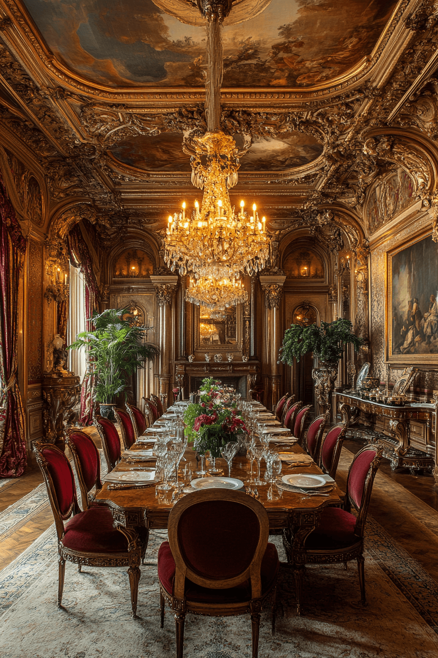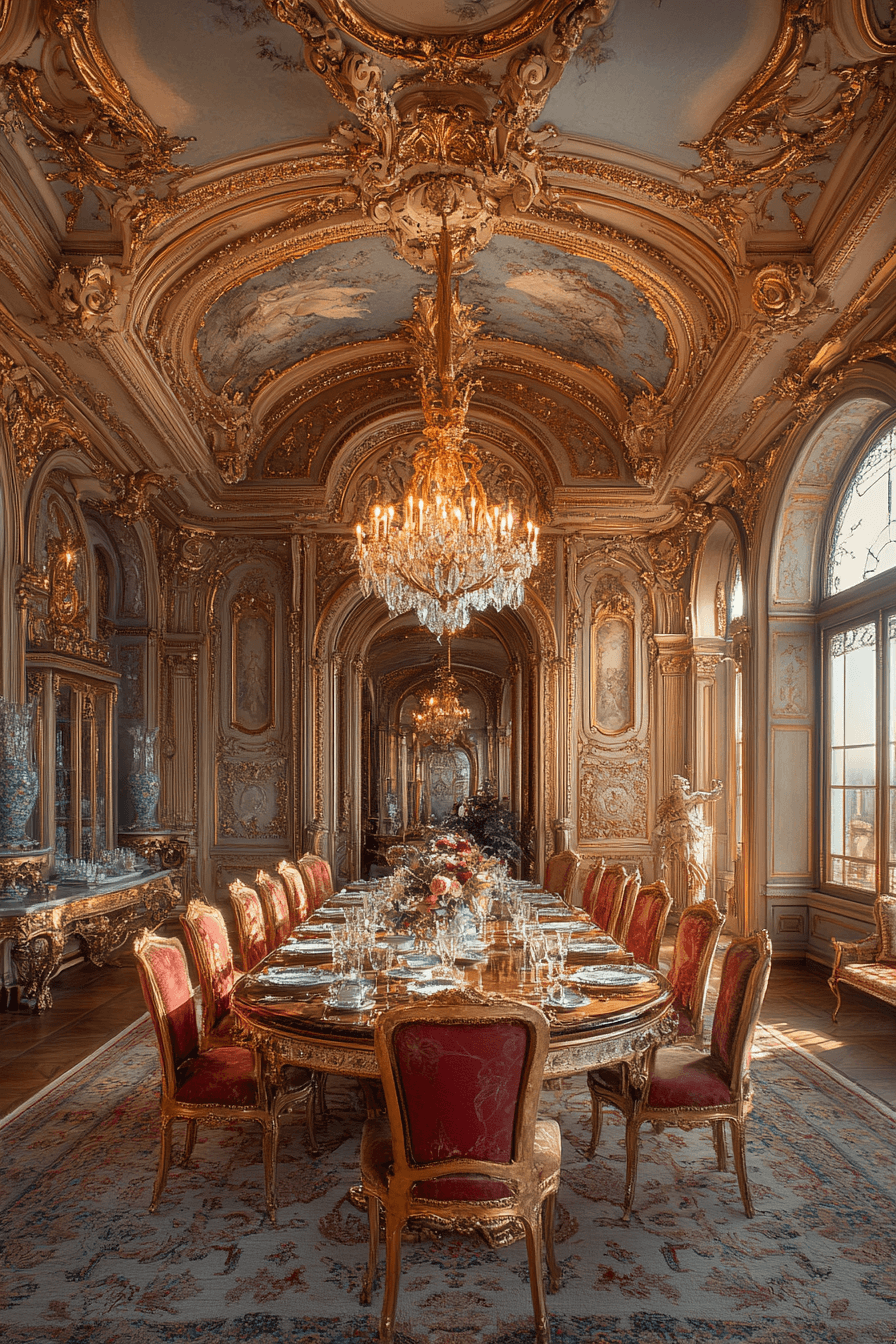 Regal drama fills antique dining rooms inspired by the grandeur of Louis XIV design. Rich fabrics, gilded accents, and ornate carvings create a luxurious visual experience. Magnificent chandeliers and intricate details add layers of opulent beauty. The overall atmosphere feels theatrical, glamorous, and full of royal energy. These antique dining rooms transform everyday meals into unforgettable celebrations. Step into royal elegance with Louis XIV–inspired antique dining rooms and make every dinner extraordinary!