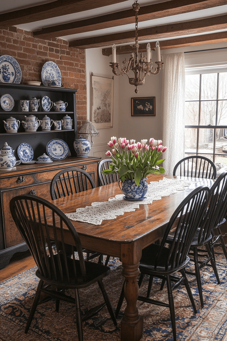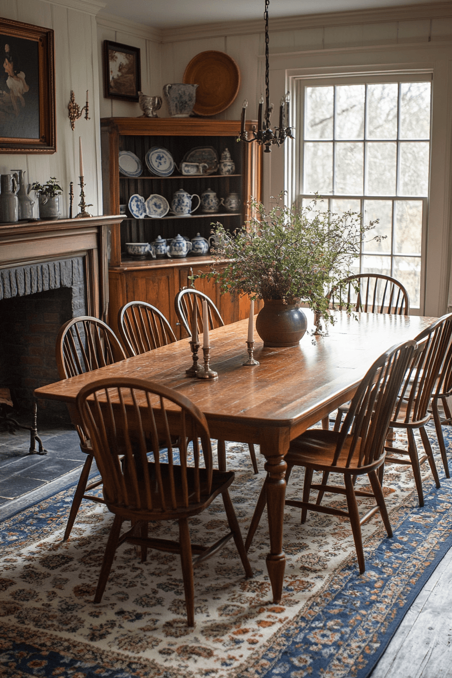 Heritage charm and welcoming warmth define antique dining rooms inspired by Dutch Colonial style. Dark wood furnishings and handcrafted touches add richness and depth to the space. Traditional design details blend rustic comfort with subtle sophistication. The room naturally encourages relaxed conversation and joyful gatherings. These antique dining rooms feel timeless, cozy, and incredibly inviting. Create a welcoming atmosphere in your home with Dutch Colonial antique dining rooms and gather around the table in style!