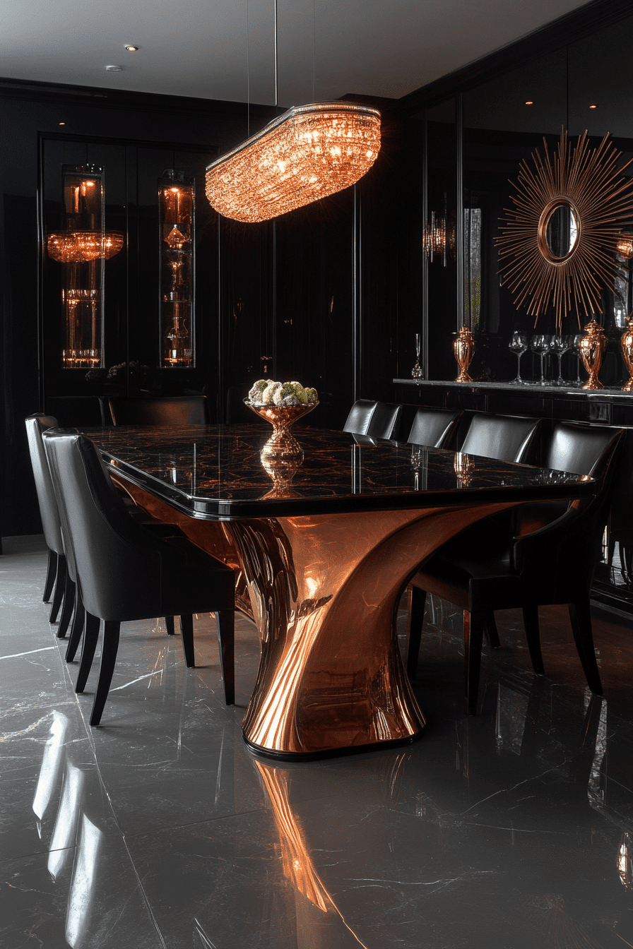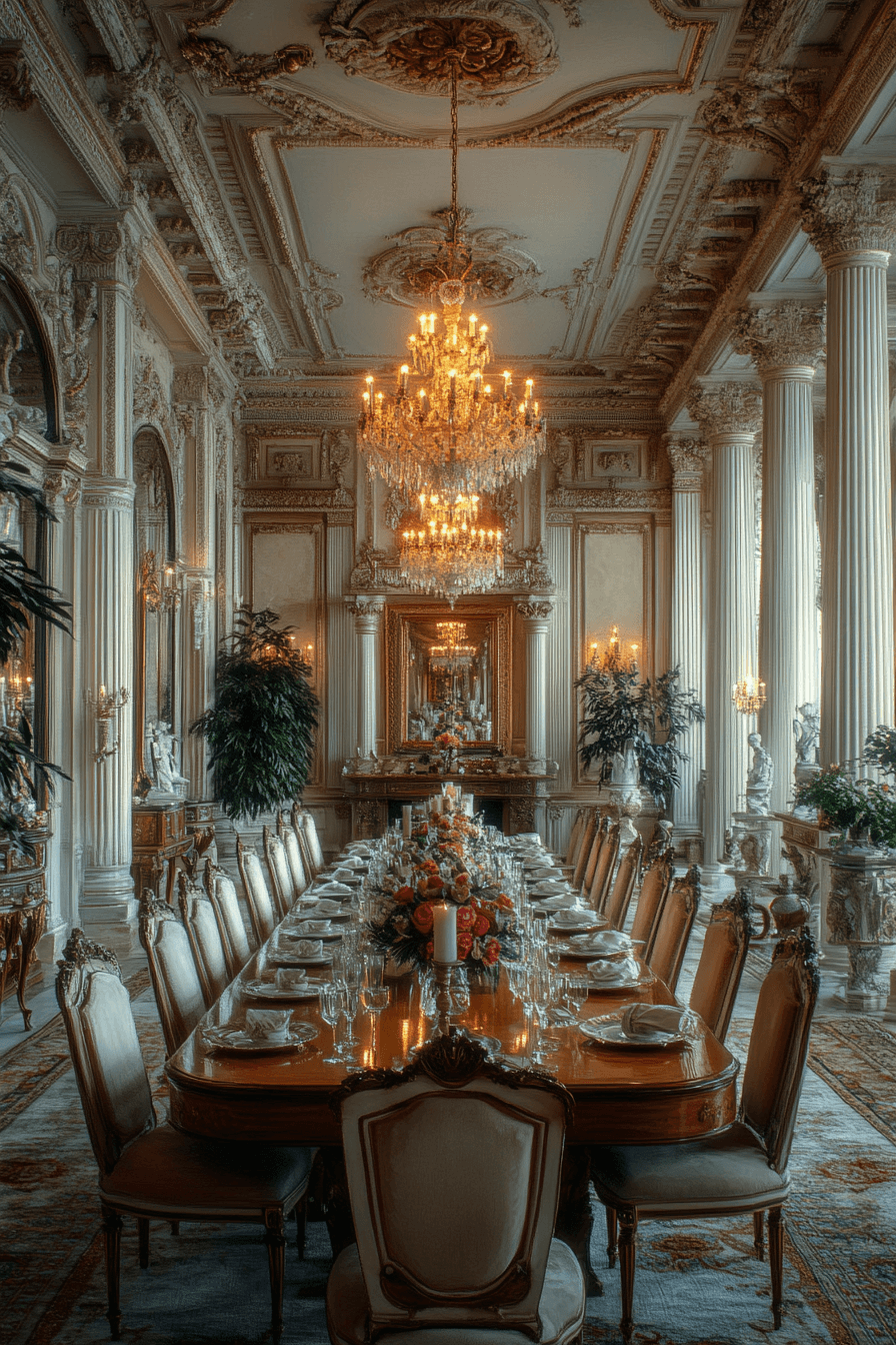 Lavish curves and artistic details transform antique dining rooms influenced by dramatic Baroque design. Deep, luxurious colors combine with ornate finishes to create a truly captivating visual experience. Sculptural furniture and layered textures bring energy and personality into the space. Decorative chandeliers and glowing accent lighting enhance the rich atmosphere. These antique dining rooms turn every dinner into an unforgettable occasion filled with grandeur. Add a touch of theatrical luxury to your home and explore the beauty of Baroque-style antique dining rooms!