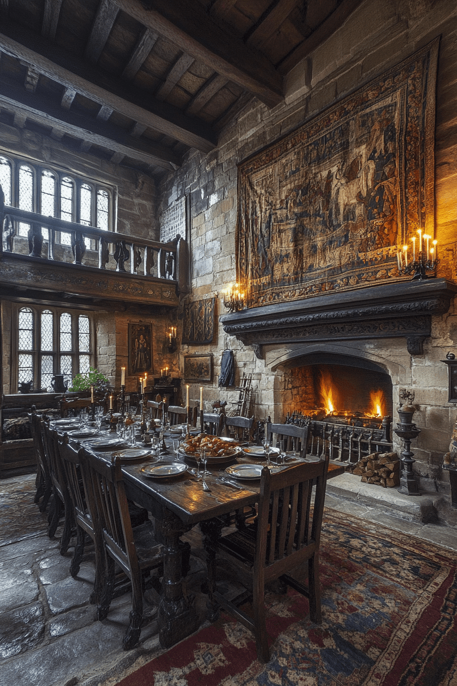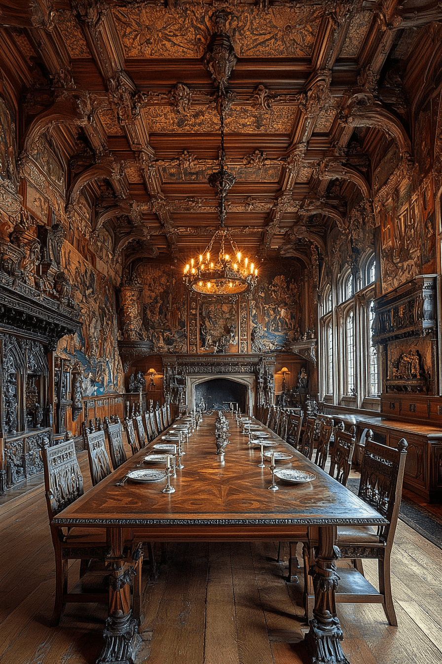 Bold history and dramatic elegance come together in antique dining rooms inspired by Elizabethan grandeur. Massive wood tables and stately chairs immediately establish a powerful presence in the room. Intricate carvings, rich fabrics, and decorative details layer the space with texture and visual depth. The overall atmosphere feels ceremonial yet warmly welcoming for gatherings of friends and family. These antique dining rooms create the perfect stage for memorable dinners and festive celebrations. Step into timeless splendor and discover how Elizabethan-inspired antique dining rooms can elevate your home today!