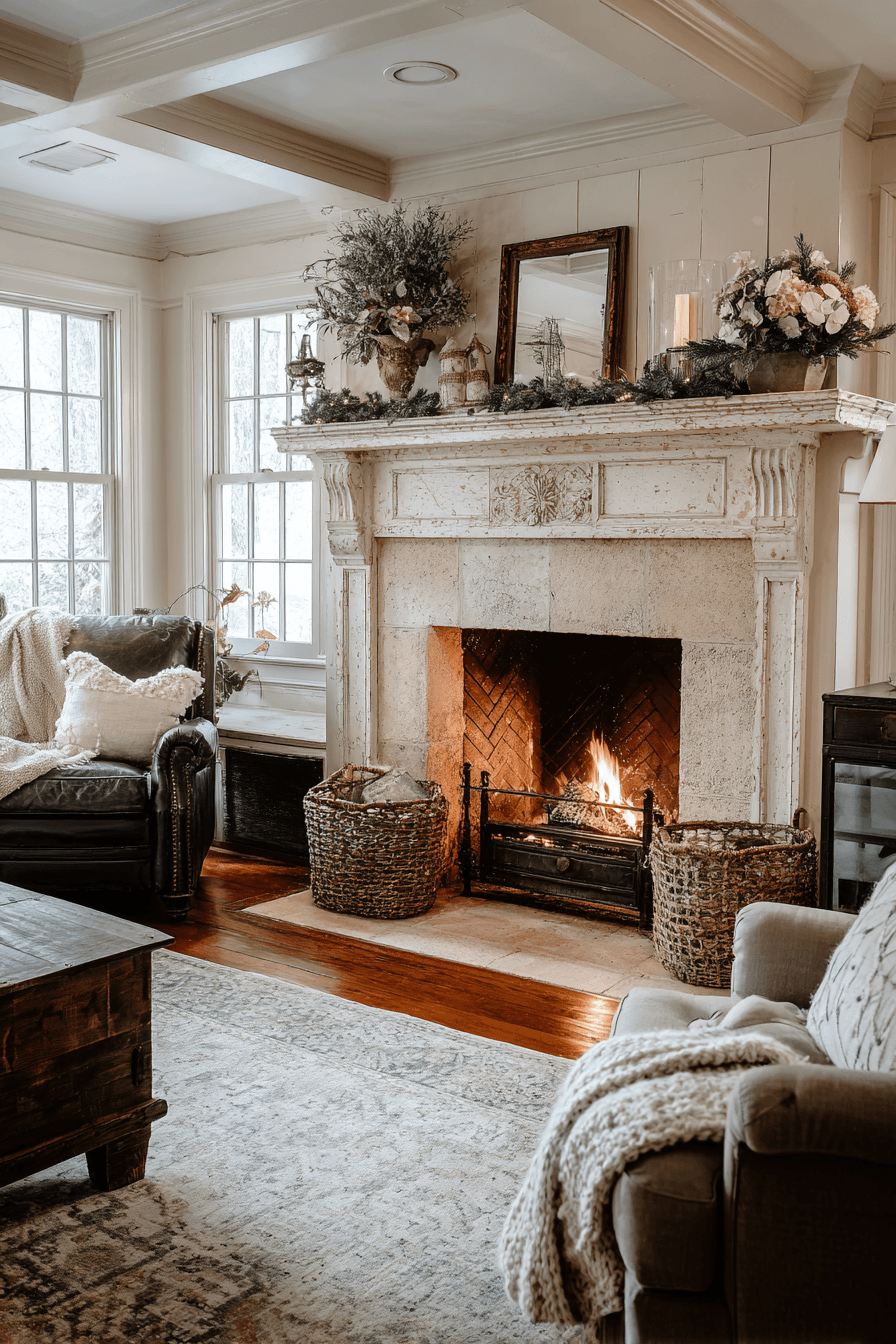 A vintage-style fireplace becomes a stunning focal point in rooms styled with antique farmhouse decor. Surrounds made from exposed brick or aged stone create warmth and classic visual appeal. Whether glowing with a fire or simply serving as a design centerpiece, it encourages gathering and relaxation. Architectural details add texture while celebrating the history of the home. Antique farmhouse decor feels most complete when anchored by a welcoming hearth. Click to explore antique farmhouse decor fireplace ideas that make living spaces extra cozy!