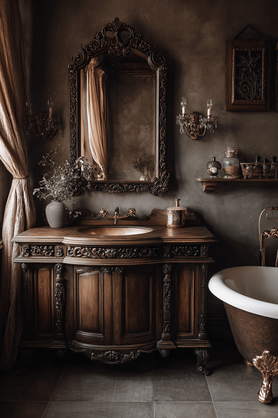 An antique-inspired vanity brings elegance and everyday practicality to bathrooms designed with antique farmhouse decor. Rich wood tones and aged hardware introduce depth and authentic vintage charm. Carved details and spacious drawers showcase the craftsmanship of earlier eras. The naturally worn patina adds visual warmth while still supporting modern routines. Antique farmhouse decor works beautifully in bathrooms where function meets historic style. Tap to find antique farmhouse decor vanity inspiration that blends charm with daily convenience!