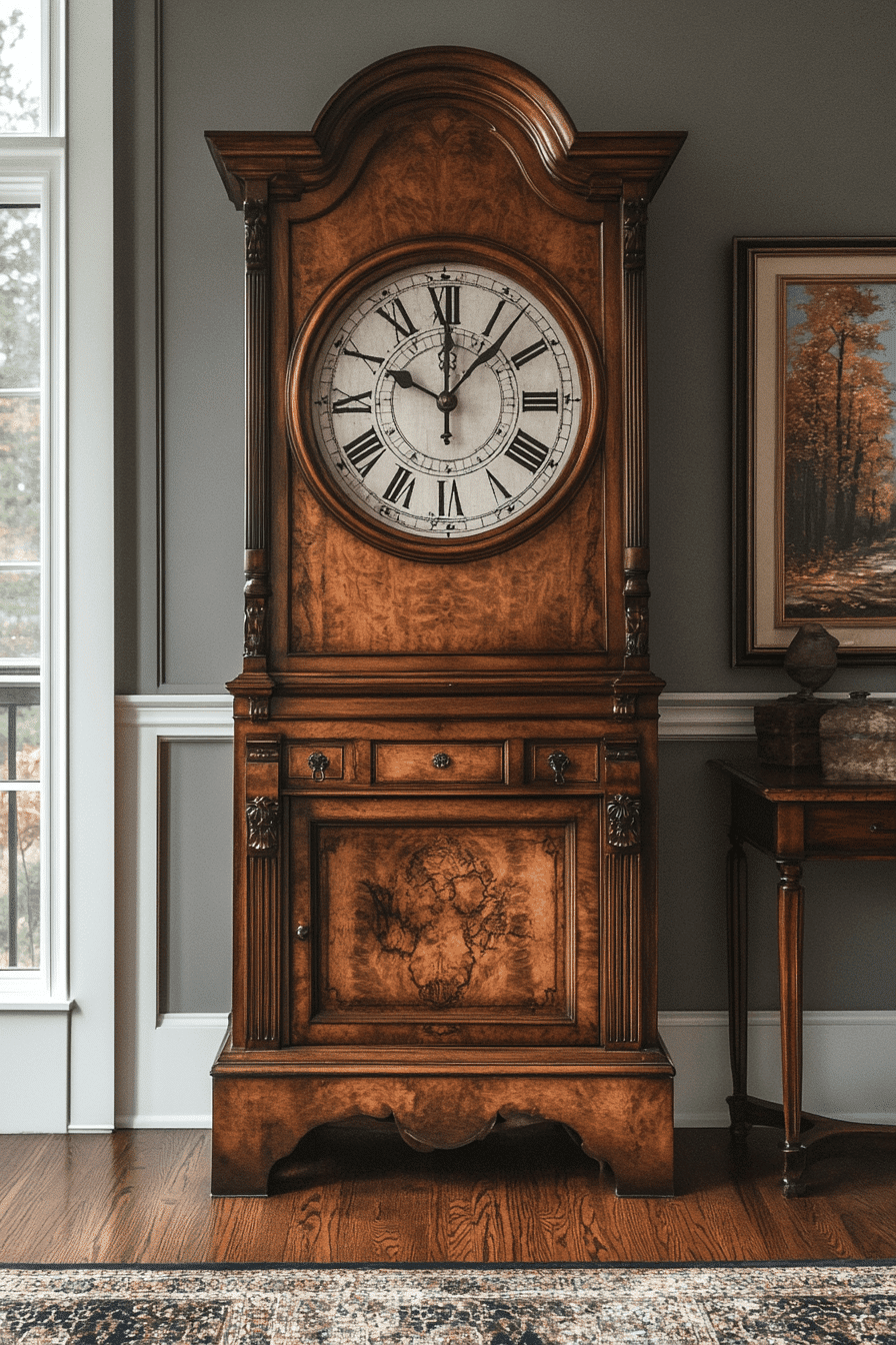 A tall grandfather clock introduces timeless charm into interiors filled with antique farmhouse decor. Its elegant height and gentle chimes create a welcoming presence in any living space. Intricately carved wood and detailed clock faces showcase traditional craftsmanship. Beyond its function, it becomes a striking heirloom that anchors the room. Antique farmhouse decor feels especially meaningful when pieces carry a sense of history. Tap to explore antique farmhouse decor accents that add lasting tradition to your home!