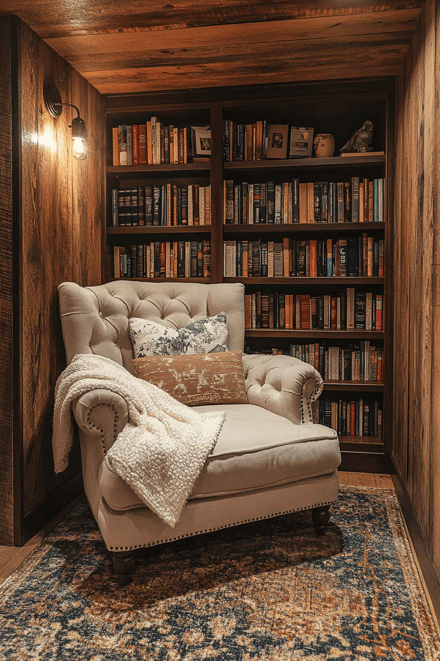 Create a peaceful escape with basement family room ideas designed for reading and quiet relaxation. Tall bookshelves, oversized armchairs, and warm layered lighting create a welcoming environment for unwinding. Soft floor cushions and lounge seating make the room comfortable for readers of every age. These basement family room ideas encourage family members to disconnect from screens and enjoy calm moments together. The serene atmosphere brings balance to busy daily routines. Tap to explore more relaxing basement family room ideas that inspire peaceful living.