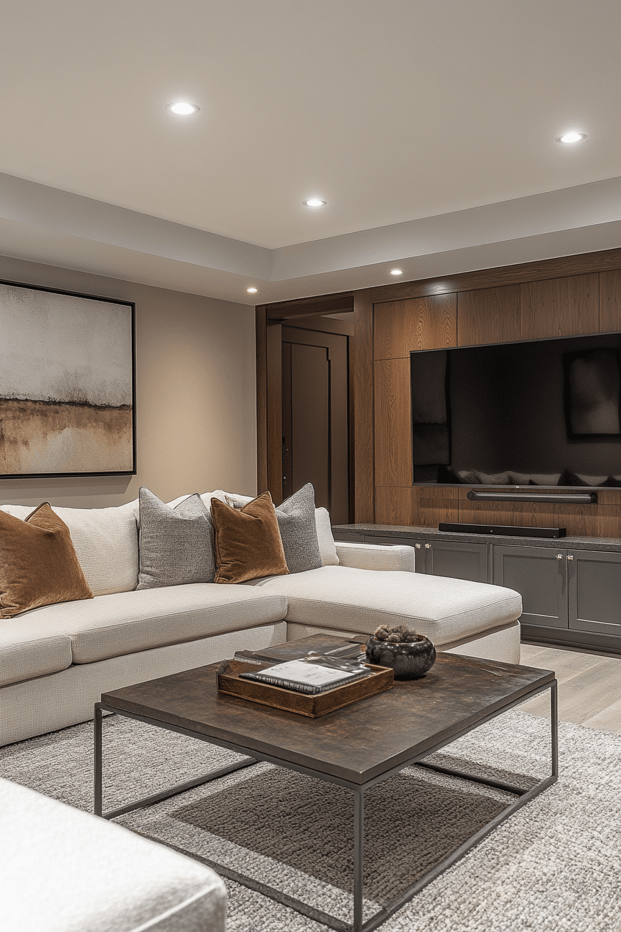 Balance flexibility and comfort with basement family room ideas designed for modern lifestyles. Modular sofas can easily shift from movie watching to family activities. Built-in storage keeps games, books, and electronics neatly organized. The room adapts effortlessly throughout the day while maintaining a polished appearance. These basement family room ideas support both relaxation and productivity. Tap to explore adaptable basement family room ideas that make the most of your space.