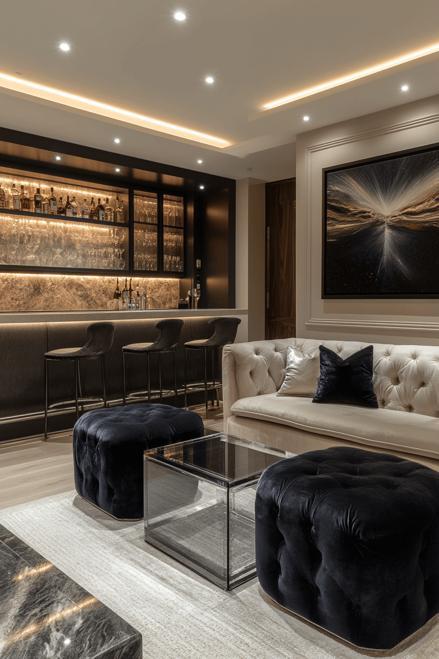 Transform your basement into a lively gathering spot with basement family room ideas that function as a stylish lounge. Modern seating, statement art, and a small bar area create a fun social atmosphere. Rich colors and thoughtfully chosen accents bring energy into the design. Strategic lighting sets the perfect mood for evening conversations and celebrations. These basement family room ideas turn an unused level into a vibrant entertainment space. Click to uncover basement family room ideas that help you host with confidence.