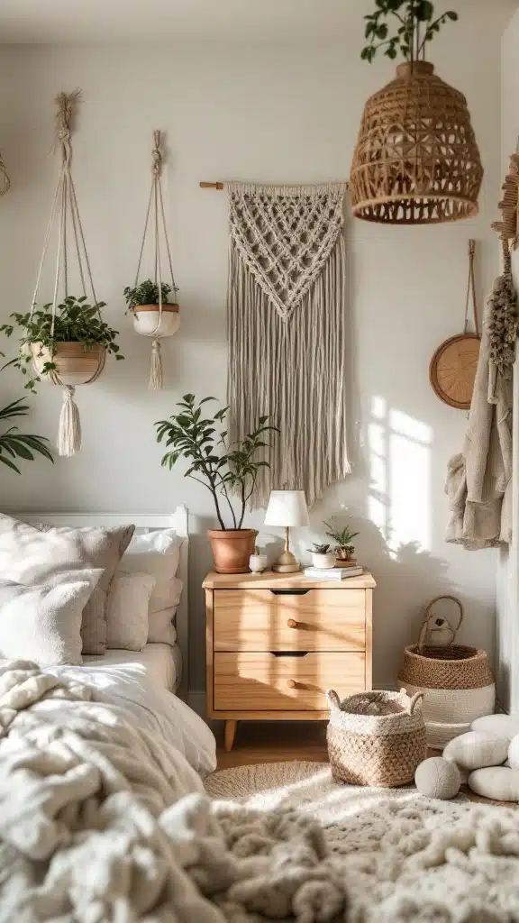 Macramé Magic transforms any space into a whimsical haven with intricate wall hangings, plant holders, and lampshades that exude a cozy boho vibe. The soft, neutral color palette of creamy whites and earthy tones complements natural wood accents and organic fabrics, creating a harmonious balance of texture and warmth.