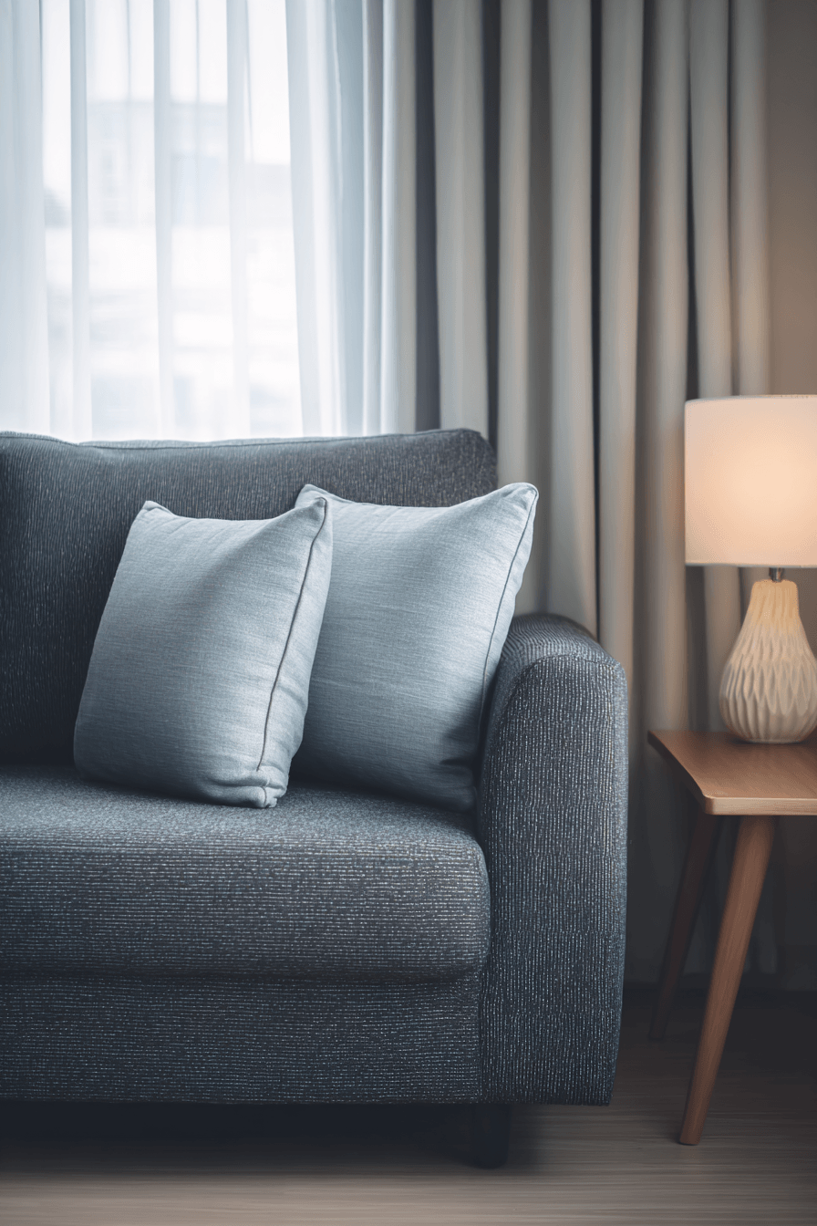 Timeless design meets modern simplicity in a charcoal couch living room styled with elegant restraint. The charcoal sofa anchors the room while sleek furniture pieces maintain a clean, uncluttered appearance. High-quality materials and subtle decorative accents bring quiet sophistication to the space. A mostly neutral palette allows the couch to remain the visual focal point. Soft lighting keeps the room feeling calm, welcoming, and refined. Explore more beautifully simple living room concepts to inspire your next update.