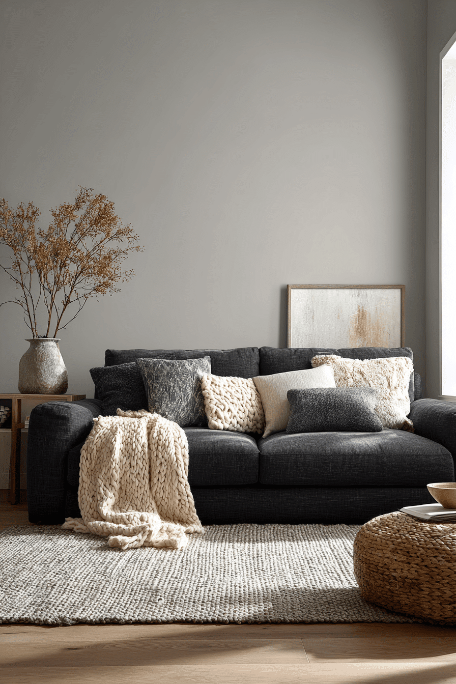 Comfort and texture take center stage in a charcoal couch living room layered with cozy materials. Plush throws, velvet pillows, and soft woven rugs surround the sofa, creating an inviting and tactile environment. The cool depth of the charcoal couch contrasts beautifully with warm fabrics and neutral walls. Gentle lighting enhances the softness of the textures and makes the room feel extra welcoming. This design transforms the charcoal couch living room into the perfect place to unwind and relax. Explore more cozy styling ideas to warm up your living room today.