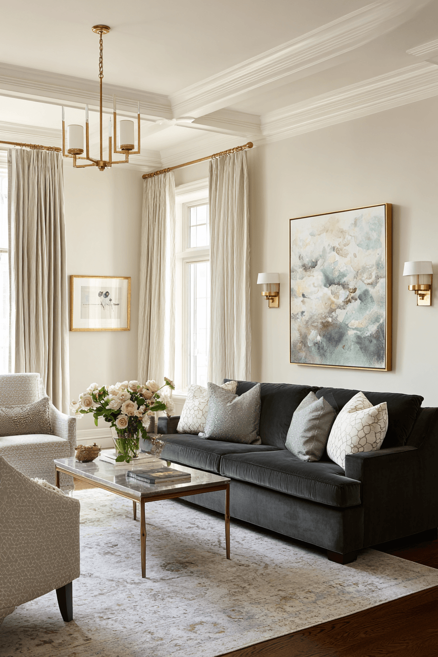 Quiet sophistication shines through in a charcoal couch living room designed with subtle luxury. The deep charcoal sofa pairs beautifully with elegant materials like marble tables, polished wood, and delicate metallic accents. Plush rugs and soft throws add comfort while keeping the overall design refined. Carefully chosen lighting enhances the textures and materials without overwhelming the room. This charcoal couch living room feels upscale yet effortlessly comfortable. Discover more ideas that bring understated luxury into your living space.