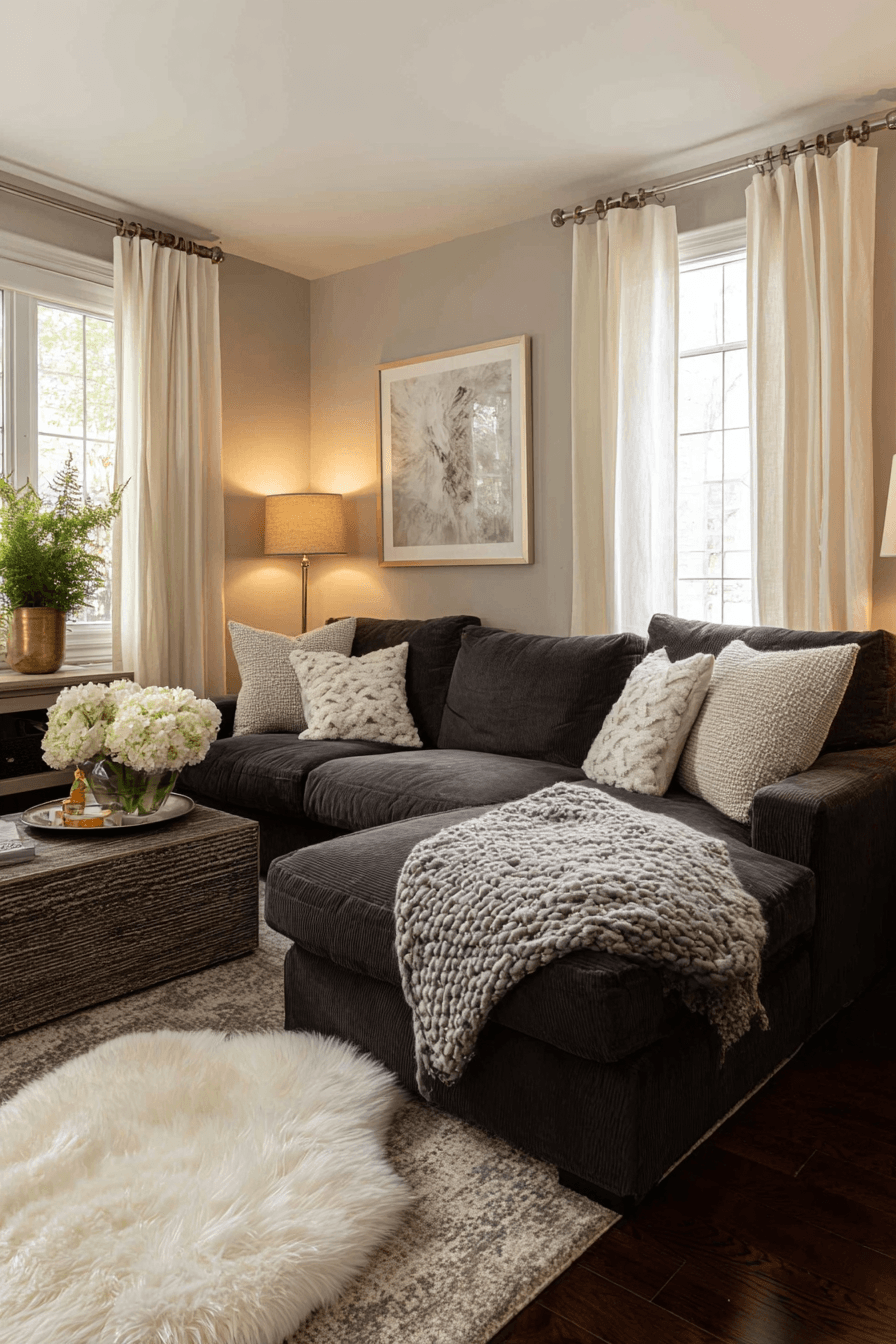 Warm neutrals create a cozy retreat in a charcoal couch living room styled with inviting tones. Cream, beige, and taupe accents soften the dark sofa and add balance to the design. Layered textures like chunky blankets, woven baskets, and plush rugs bring warmth and depth to the space. Soft ambient lighting enhances the relaxed and welcoming vibe. The charcoal couch living room becomes a comfortable gathering place for both family and guests. Browse more cozy neutral living room ideas to complete your look.