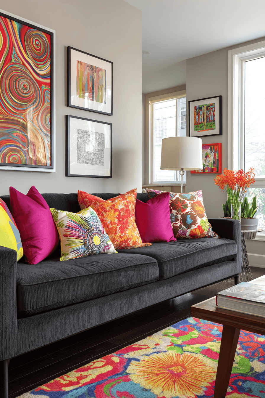 Energy and personality burst into life in a charcoal couch living room filled with bold color accents. Vibrant cushions, striking artwork, and colorful rugs stand out beautifully against the dark sofa. The charcoal couch grounds the design, preventing the bright colors from feeling overwhelming. High contrast elements add excitement while maintaining visual balance. The result is a charcoal couch living room that feels lively, modern, and full of character. Get inspired by more bold decorating ideas to energize your space.