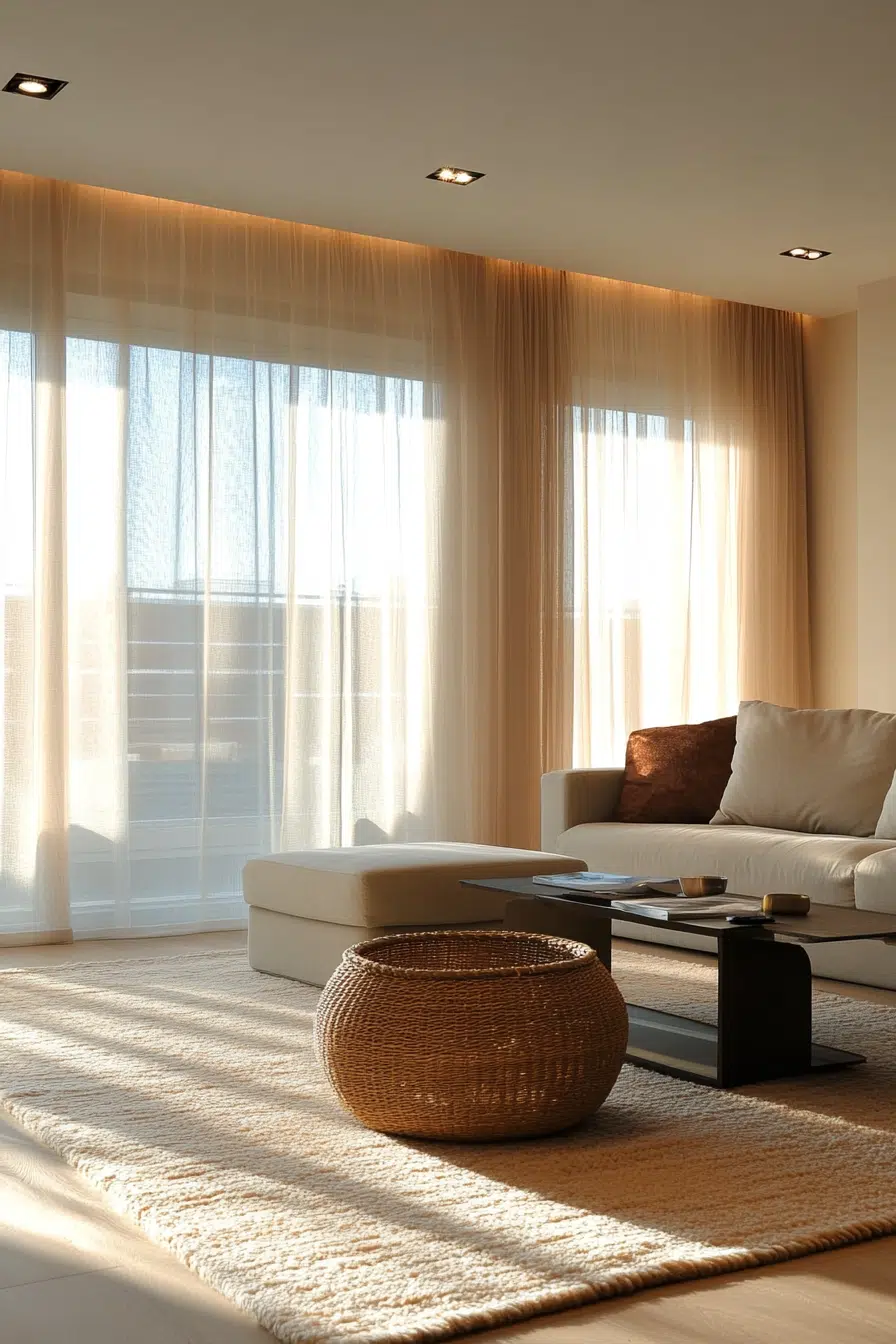 Design a bright space with these curtain ideas for living room using affordable sheer fabrics. Create beauty with light-filtering curtains from discount stores that softly diffuse sunlight. Add depth by layering simple sheers with thrifted panels for an expensive look without the cost.