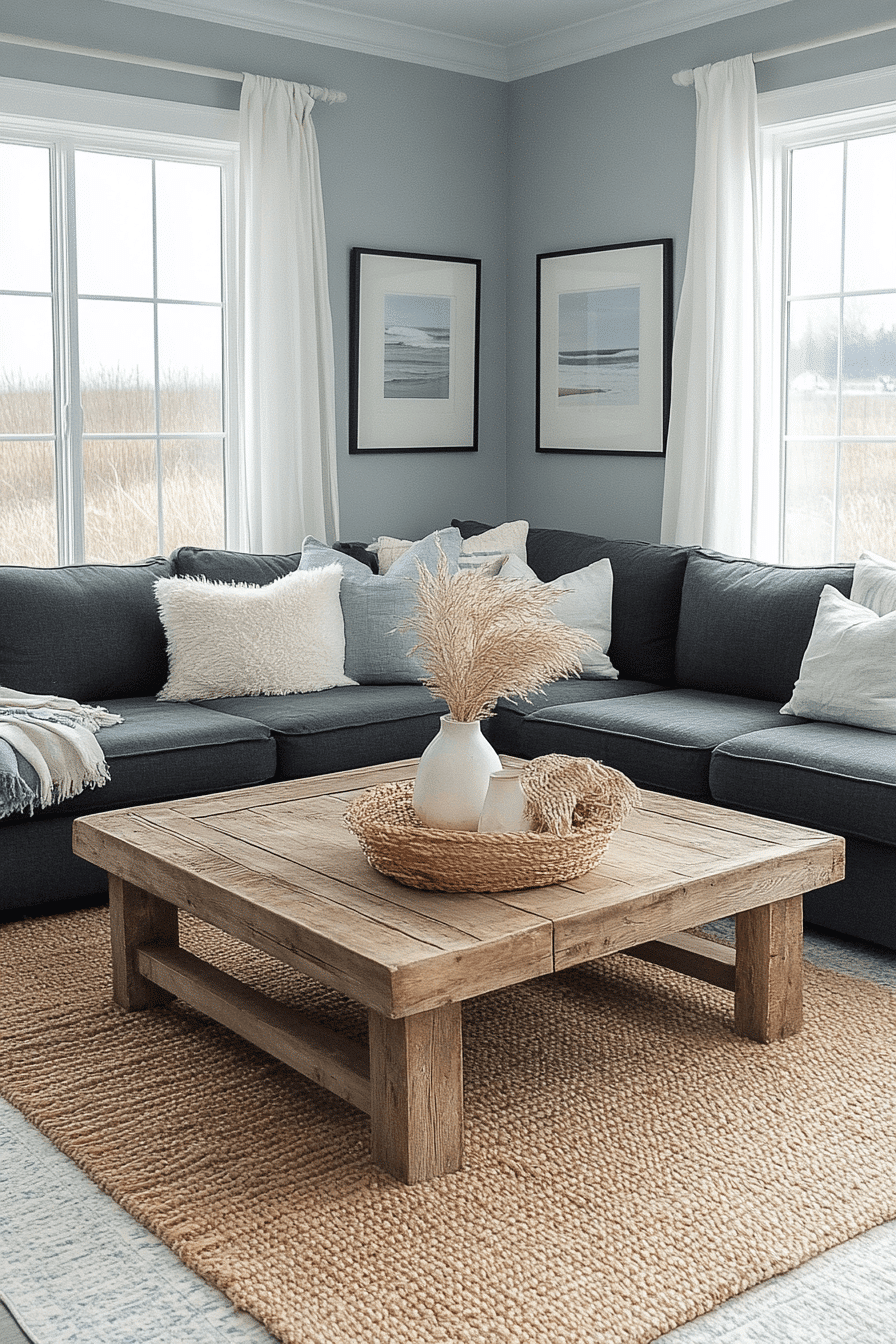 A breezy atmosphere comes alive when a dark grey sofa living room is styled with coastal-inspired colors and textures. Light blues, sandy beiges, and crisp whites create a fresh palette that feels calm and uplifting. The charcoal sofa contrasts beautifully with airy fabrics like linen and cotton, adding relaxed elegance to the space. Decorative touches such as driftwood accents, seashell details, or glass décor enhance the beachy vibe. This design makes the dark grey sofa living room feel open, peaceful, and effortlessly stylish. Tap to explore more coastal-inspired living room ideas.