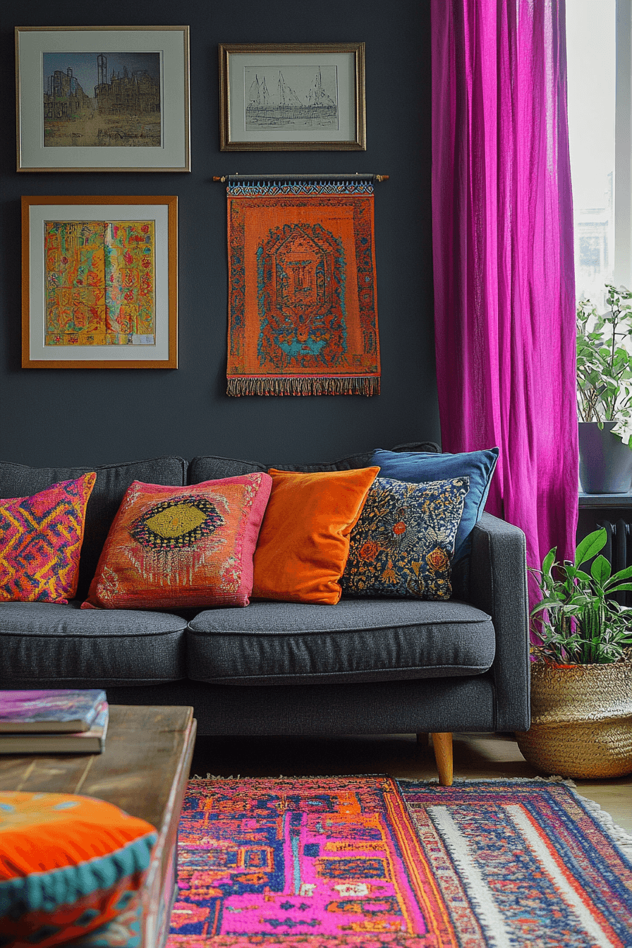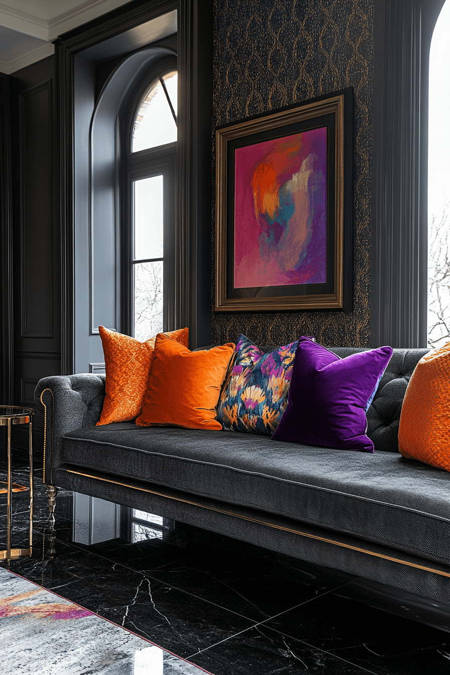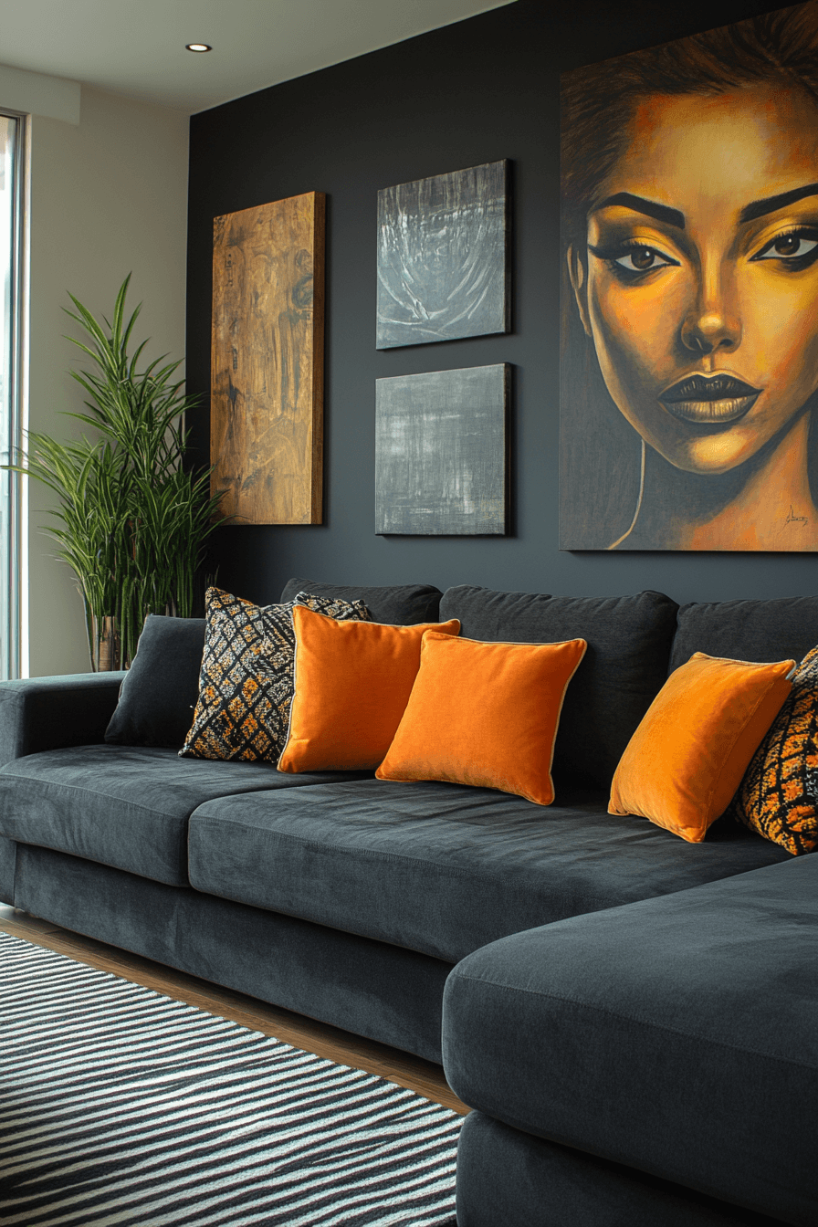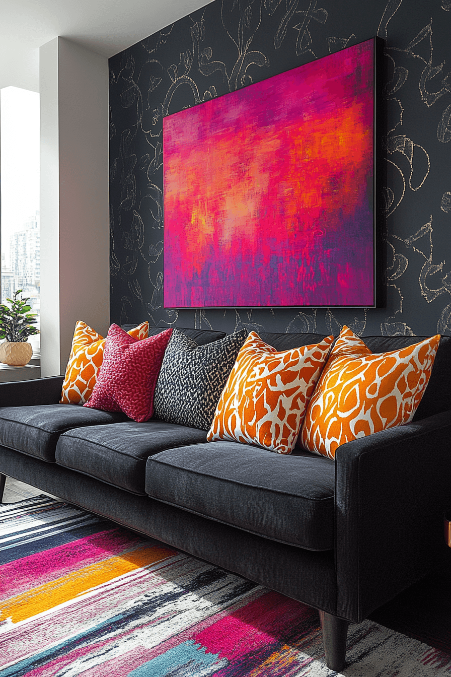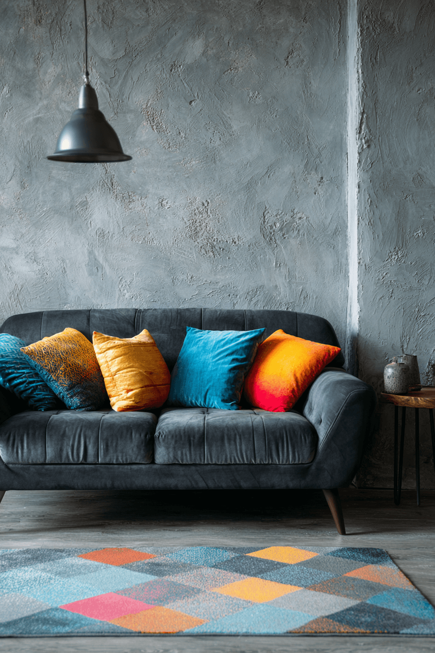 Vibrant energy fills a dark grey sofa living room when bold patterns and lively colors take center stage. The charcoal sofa acts as the perfect neutral backdrop for bright artwork and colorful rugs. Distinctive furniture pieces and striking geometric patterns add personality and excitement. The contrast between dark grey and vivid hues keeps the room visually dynamic. A creatively styled dark grey sofa living room becomes both playful and stylish. Click to discover bold and graphic living room décor ideas.