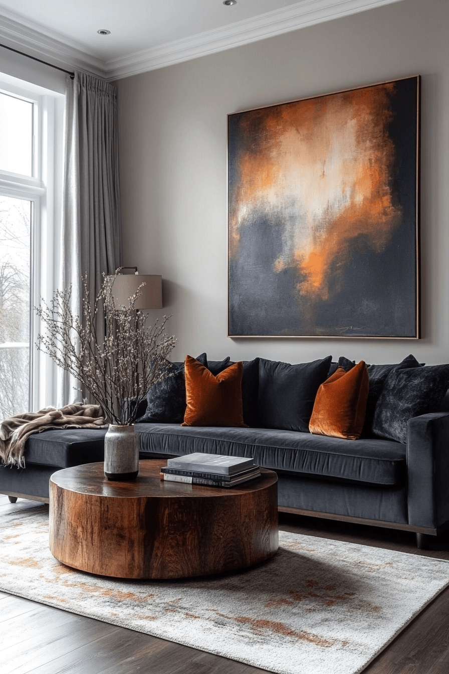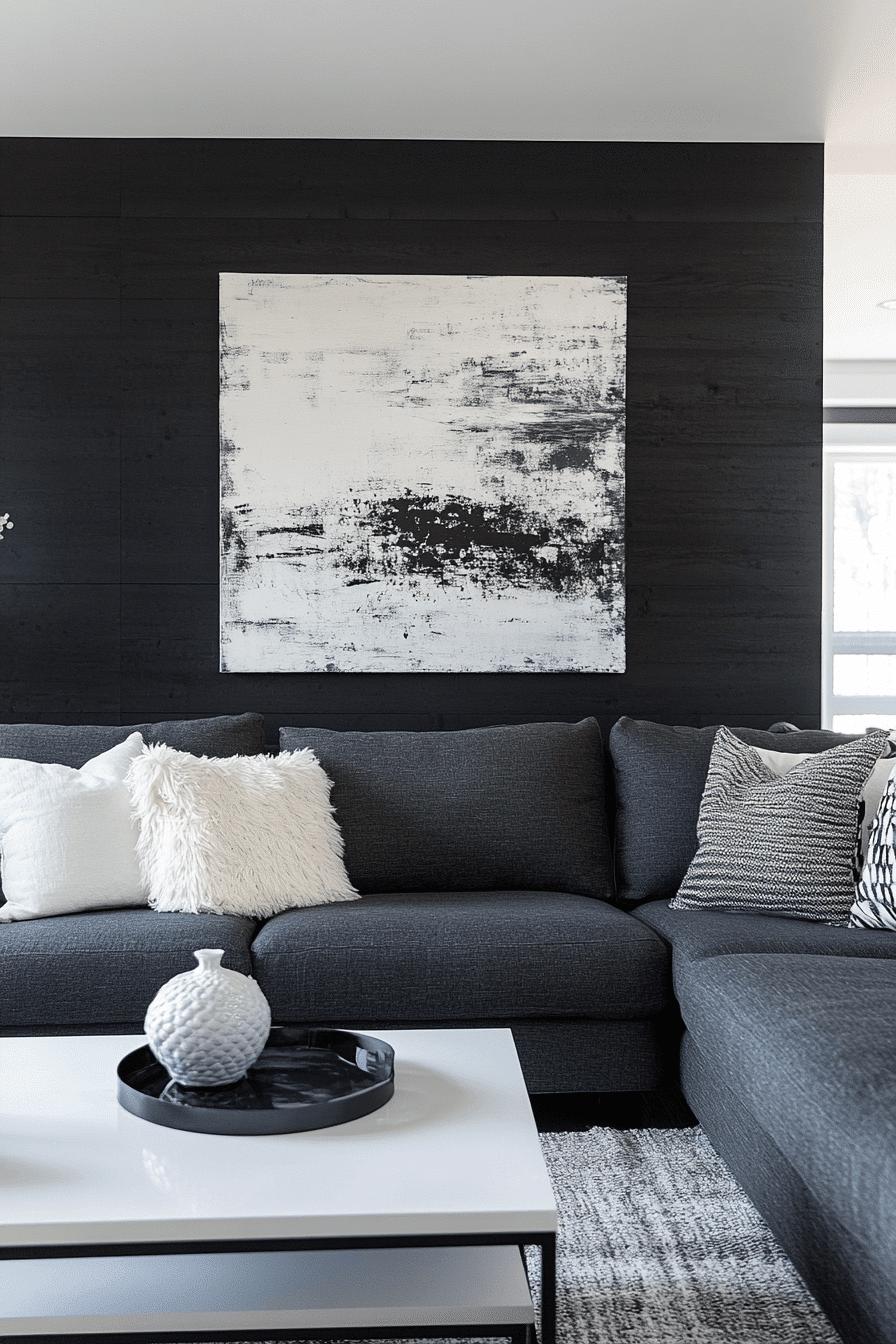 Striking visual energy fills a dark grey sofa living room designed with bold contrast. The deep grey sofa stands out dramatically against bright white walls or light-colored rugs. Pops of vivid color in artwork or accessories inject excitement and personality. Dramatic lighting and high-impact décor add an extra layer of visual interest. The result is a dark grey sofa living room that feels dynamic, modern, and unforgettable. Tap to discover more high-contrast living room styling ideas.