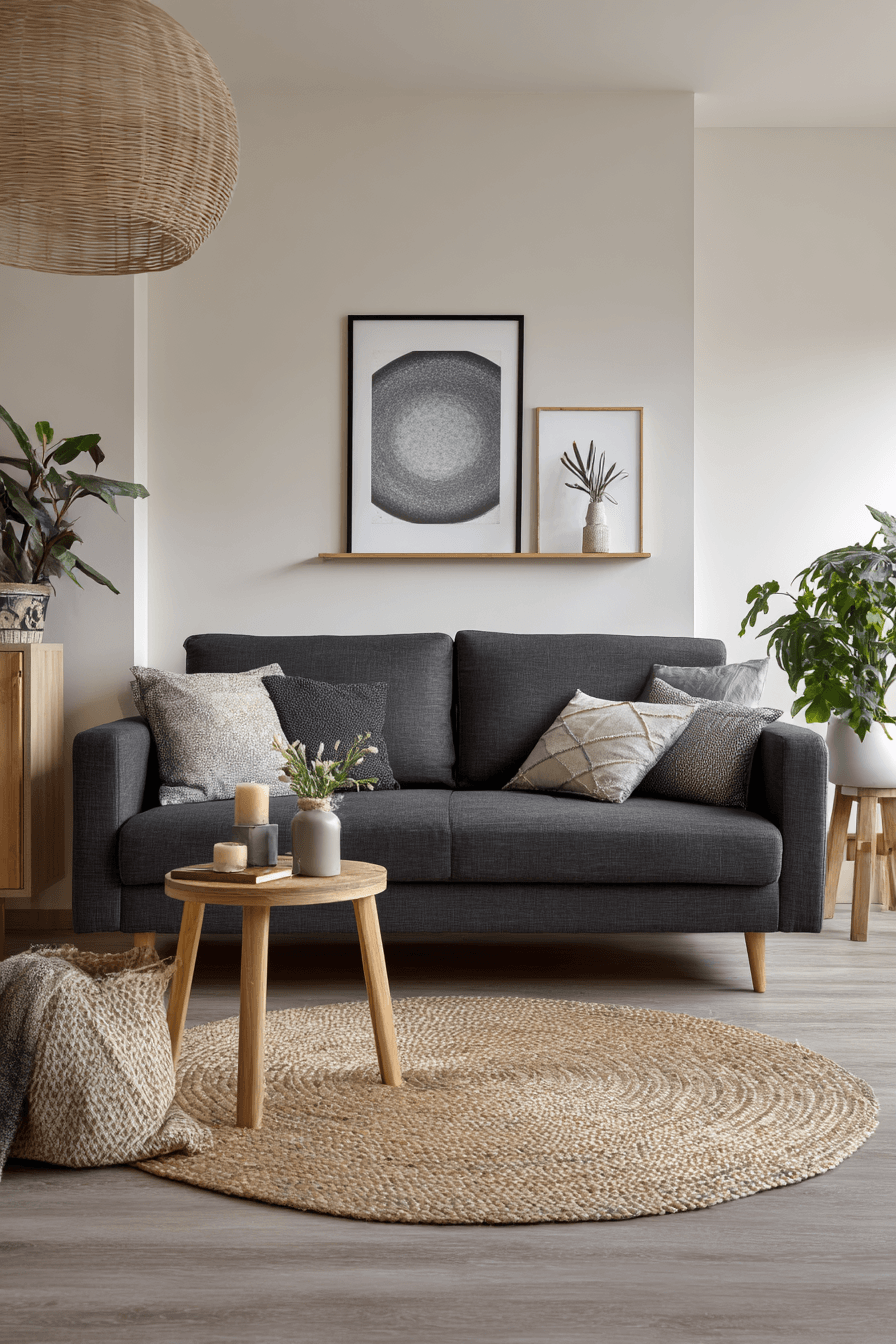 Comfort and simplicity blend effortlessly in a dark grey sofa living room inspired by Scandinavian design. Pale wood furniture and soft white tones brighten the room and create a welcoming atmosphere. The charcoal sofa grounds the design while cozy textures like wool throws and cotton rugs add warmth. Clean lines and practical furnishings keep the space feeling airy and relaxed. A well-designed dark grey sofa living room in this style feels calm, cozy, and beautifully balanced. Tap to explore more Scandinavian living room inspiration.