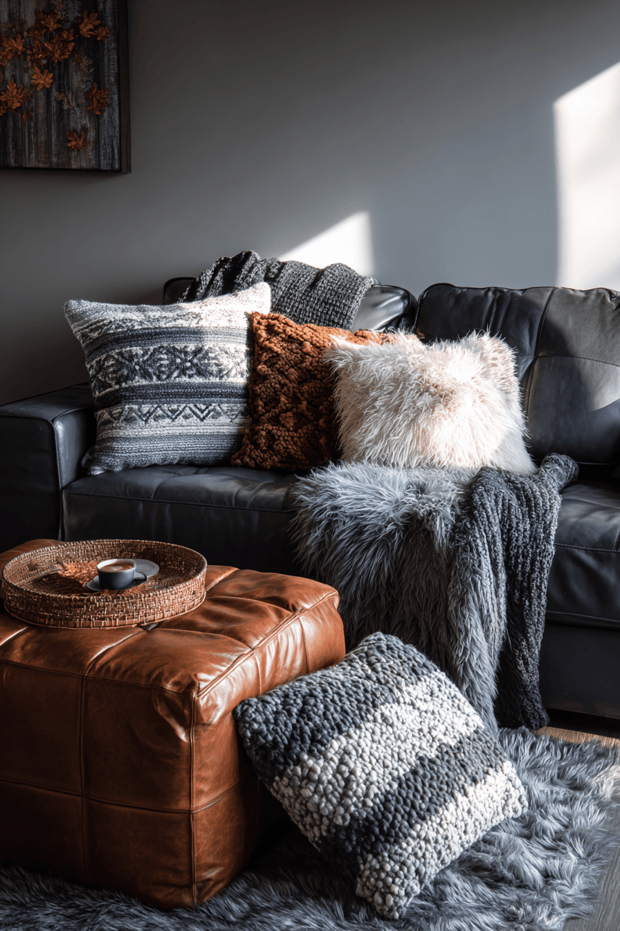 Layers of materials create visual richness in a dark grey sofa living room styled with textural depth. The charcoal sofa pairs beautifully with knitted throws, woven rugs, and suede or leather seating. These varied materials bring warmth and tactile interest to the room. A mostly neutral palette keeps the focus on texture rather than color. The result is a dark grey sofa living room that feels cozy, refined, and beautifully layered. Click to explore more textured living room décor ideas.