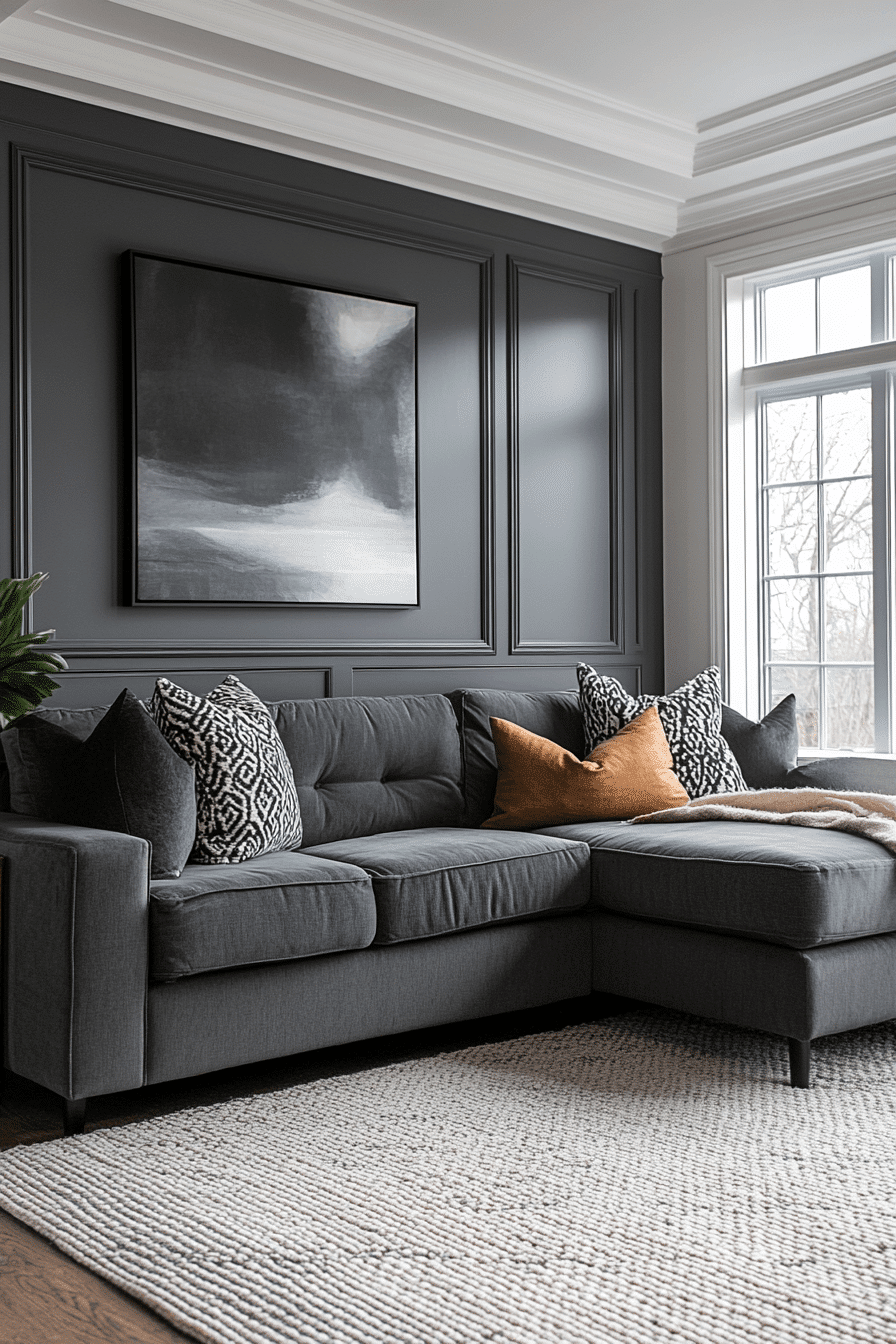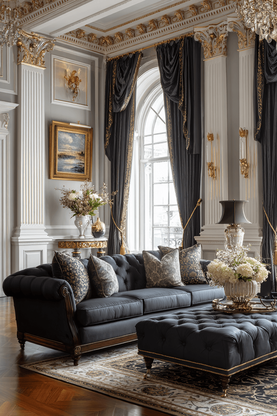 Classic elegance meets modern design in a dark grey sofa living room styled with neo-classical influence. Architectural details like crown molding or paneled walls create a timeless backdrop. The charcoal sofa pairs beautifully with refined furniture and subtle patterned fabrics. Gold accents and luxurious cushions elevate the overall sophistication. This dark grey sofa living room feels graceful, balanced, and effortlessly stylish. Click to discover more neo-classical living room design ideas.