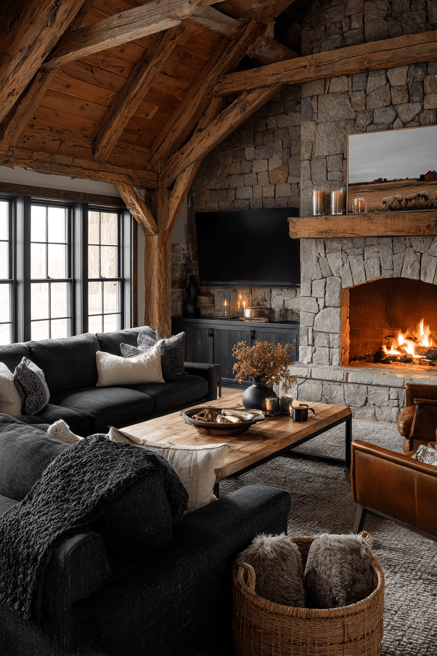 Warm comfort fills a dark grey sofa living room designed with rustic charm. Natural elements like exposed wood, distressed leather, and woven textiles bring earthy character to the space. The charcoal sofa complements these rugged textures while maintaining a cozy atmosphere. Chunky knit blankets and soft lighting enhance the welcoming feel. A rustic-inspired dark grey sofa living room feels both relaxed and beautifully lived-in. Tap to explore more warm rustic living room inspiration.