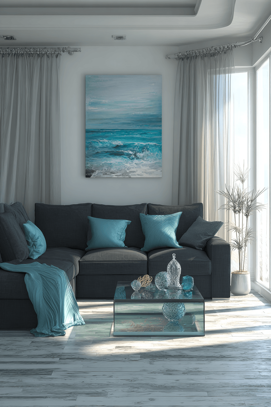 Fresh coastal energy flows through a dark grey sofa living room inspired by ocean tones and seaside textures. Shades of blue and sea-glass green beautifully complement the charcoal sofa while creating a calm and refreshing palette. Nautical décor, woven accents, and light fabrics help reinforce the breezy coastal vibe. Clean lines and simple patterns keep the room feeling open and modern. This approach turns a dark grey sofa living room into a relaxing retreat reminiscent of the shoreline. Click to explore more ocean-inspired living room decorating ideas.