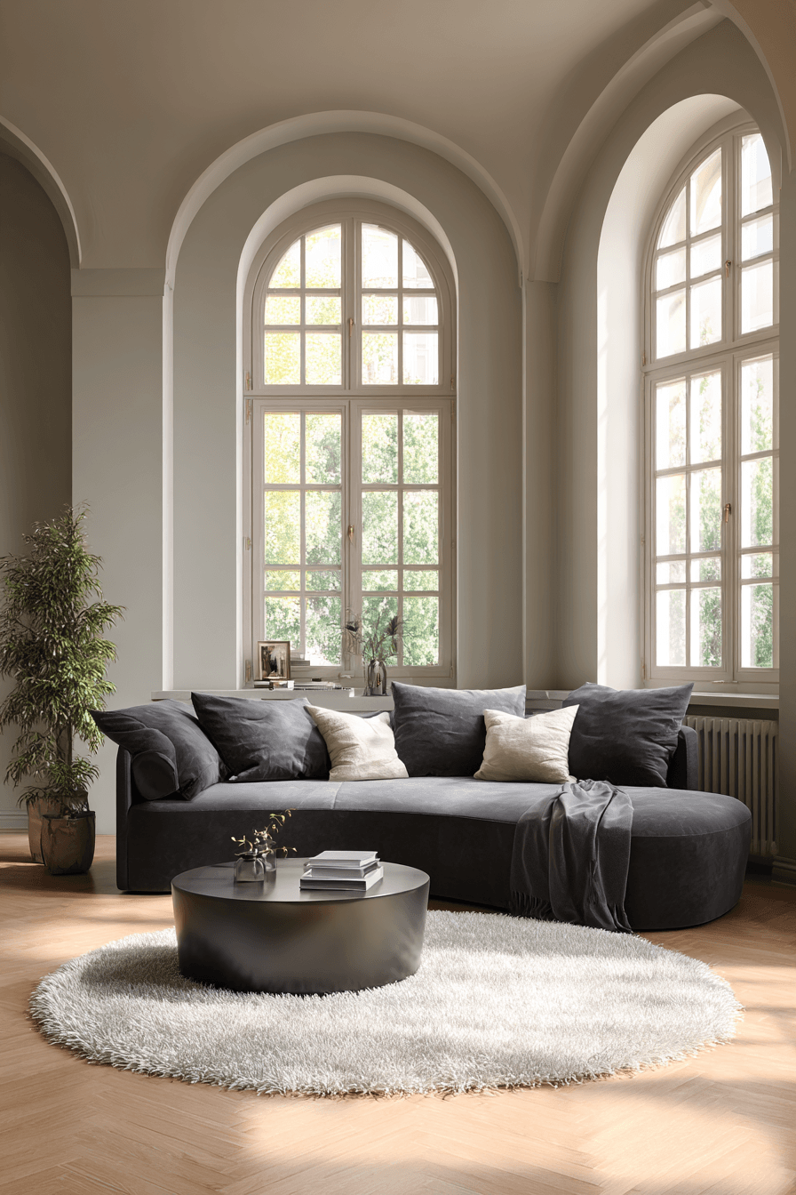 A welcoming modern atmosphere appears in a dark grey sofa living room that blends contemporary style with soft textures. Rounded furniture shapes and gentle neutral tones soften the bold presence of the charcoal sofa. Organic materials and cozy fabrics create a comfortable yet modern environment. This combination keeps the room feeling stylish without sacrificing warmth. A thoughtfully designed dark grey sofa living room offers both visual beauty and everyday comfort. Tap to explore more soft modern living room ideas.