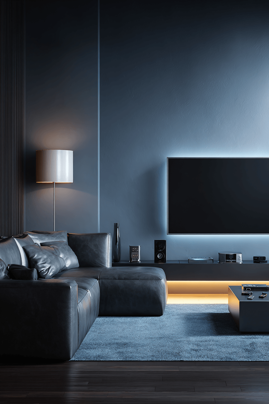 Smart design meets sleek style in a dark grey sofa living room equipped with modern technology. The charcoal sofa becomes the stylish centerpiece surrounded by smart lighting, entertainment systems, and voice-activated features. Clean lines and a monochrome palette keep the room looking sophisticated and uncluttered. High-tech elements blend seamlessly with contemporary décor for a futuristic feel. A tech-inspired dark grey sofa living room offers both comfort and cutting-edge convenience. Click to discover more high-tech living room inspiration.