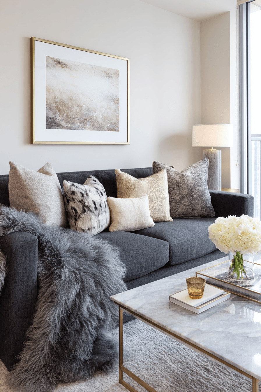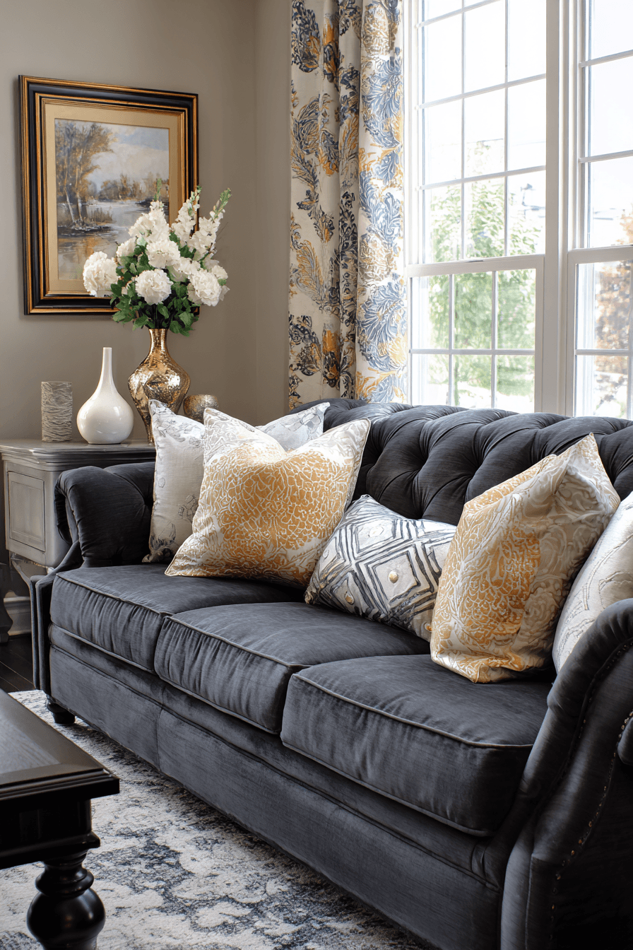 A subtle shimmer transforms the atmosphere in a dark grey sofa living room decorated with metallic accents. Frames, lamps, and décor pieces in silver, chrome, or brushed nickel bring refined shine to the space. These reflective finishes enhance the rich tone of the charcoal sofa. The balance between matte grey upholstery and metallic sparkle feels sophisticated and modern. A thoughtfully styled dark grey sofa living room with metallic touches feels polished and elegant. Click to explore more metallic décor ideas for your living room.