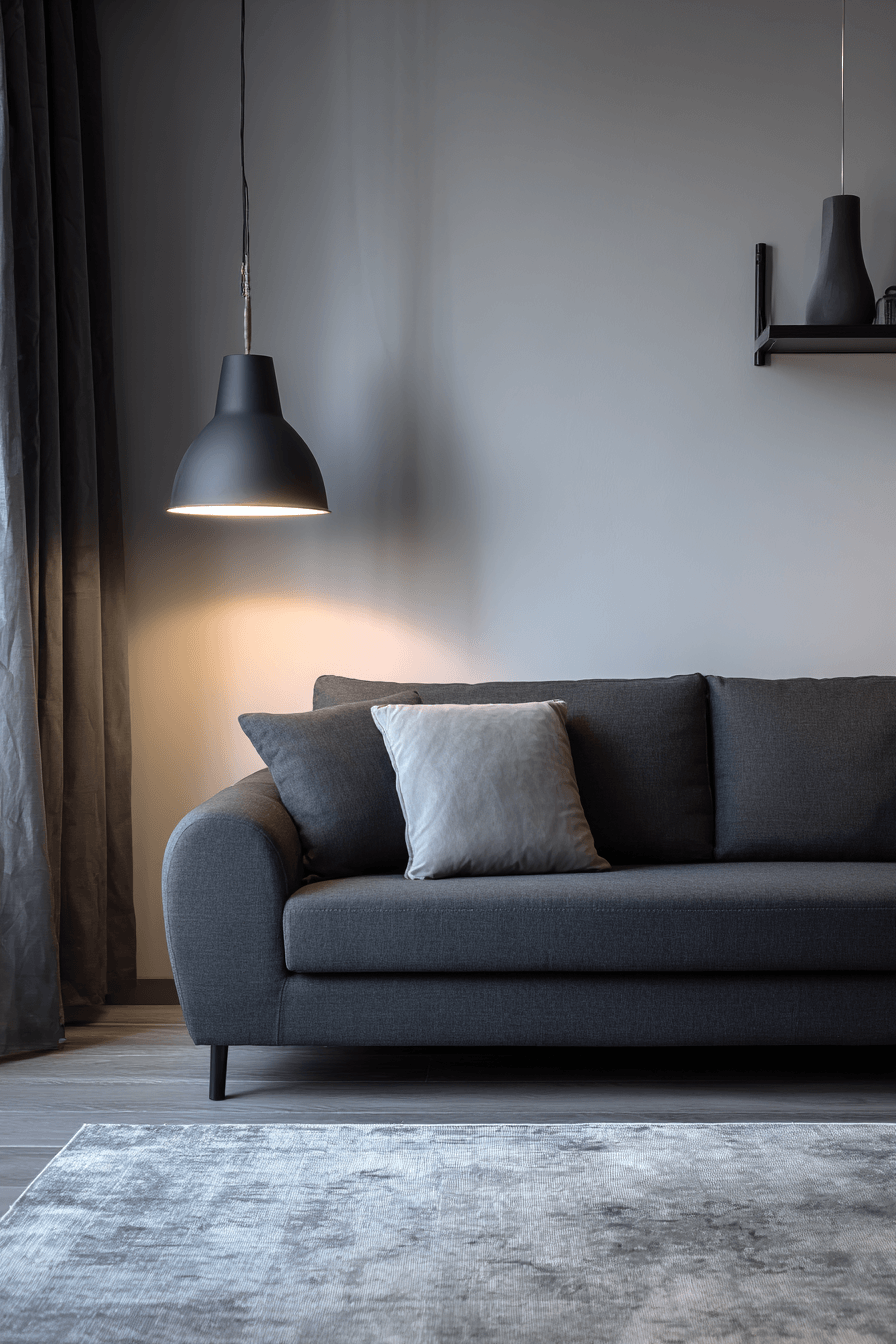 Bold lines and dramatic contrast energize a dark grey sofa living room designed with contemporary edge. The charcoal sofa stands out against crisp white walls and sleek black accents. Streamlined furniture and modern lighting highlight the room’s sharp architectural style. The clean design keeps the space feeling open and striking. A bold dark grey sofa living room built on contrast delivers strong visual impact. Tap to explore more sharp contemporary living room ideas.