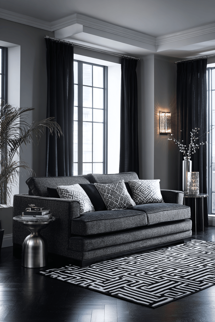 A striking palette of black, white, and grey creates a dramatic look in a dark grey sofa living room designed with monochrome style. The charcoal sofa anchors the space while layers of grey tones add depth and sophistication. Patterns and textures in similar shades prevent the room from feeling flat. Sleek furniture and geometric décor enhance the modern vibe. A monochromatic dark grey sofa living room feels bold, stylish, and effortlessly cohesive. Tap to discover more monochrome living room inspiration.