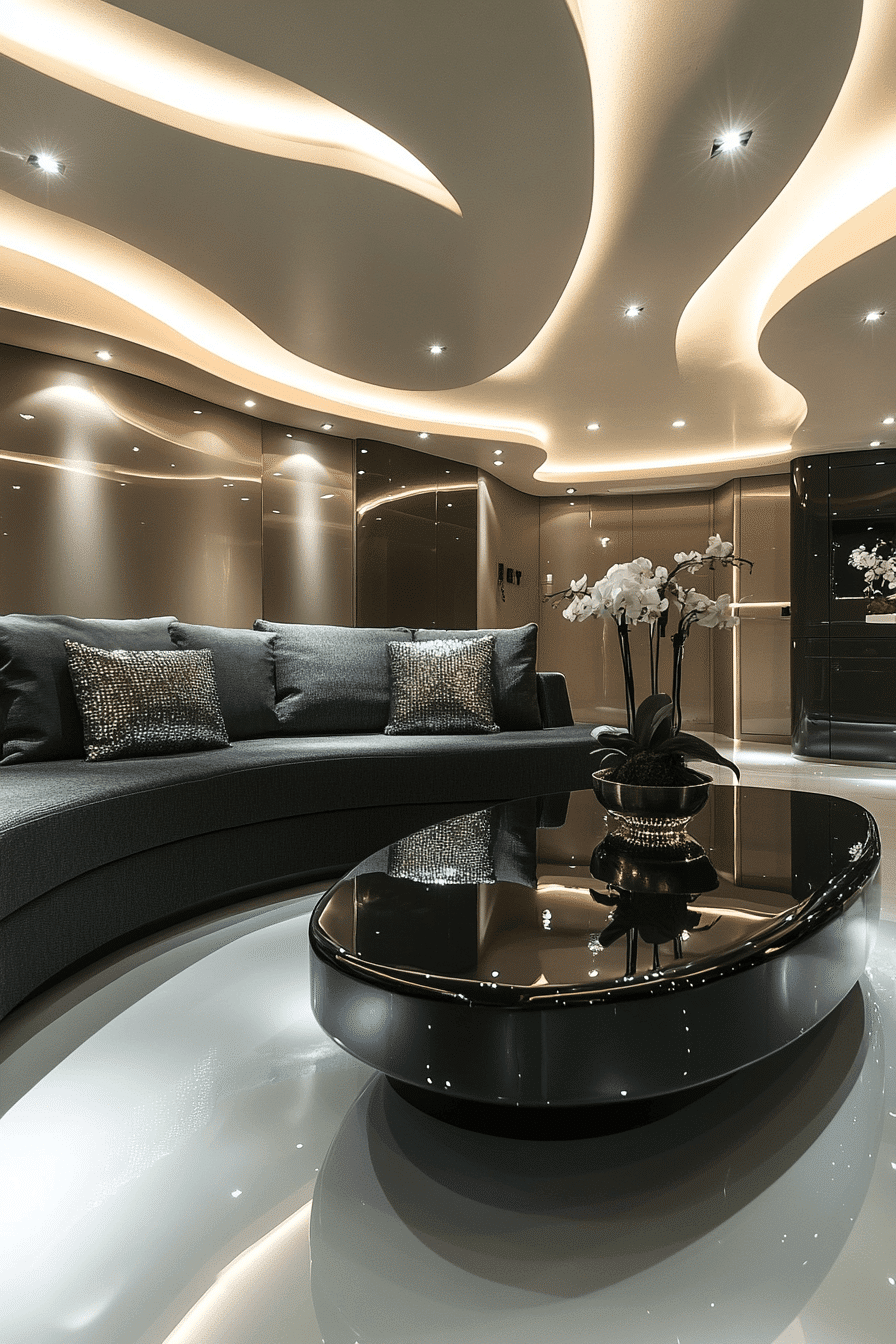 A futuristic edge transforms a dark grey sofa living room into a bold and modern retreat. Smooth lines, reflective finishes, and creative lighting introduce a high-tech feel to the space. The charcoal sofa anchors the design while metallic accents and white surfaces add striking contrast. Innovative lighting fixtures highlight the sleek architectural elements throughout the room. This dark grey sofa living room feels forward-thinking and visually exciting. Click to explore more futuristic interior design ideas.