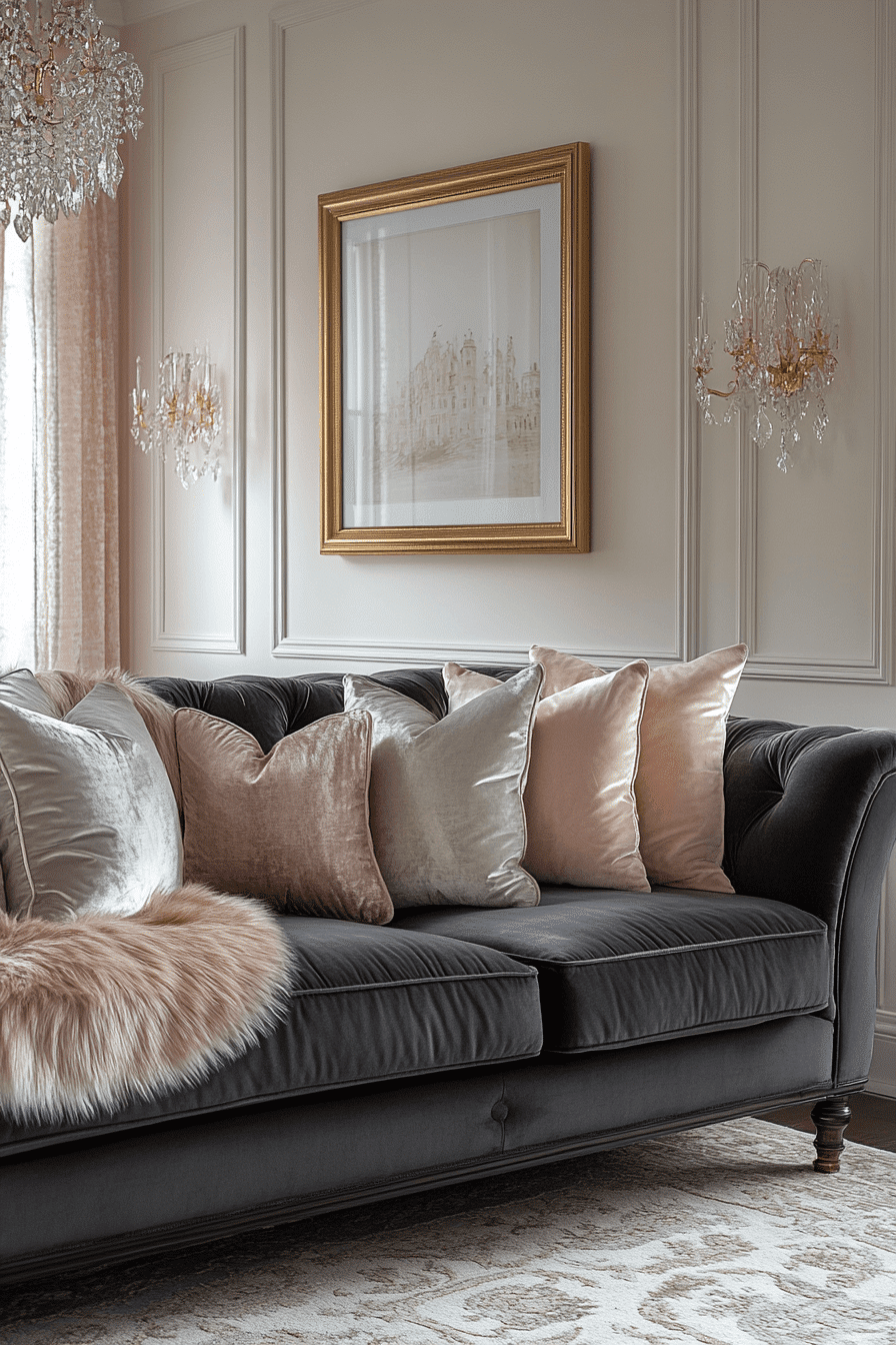 Gentle elegance shines through in a dark grey sofa living room styled with soft glamour touches. Muted pastels and delicate tones surround the charcoal sofa to create a soothing palette. Velvet pillows, silky curtains, and plush fabrics add luxurious comfort. Reflective décor and soft lighting enhance the graceful atmosphere of the space. This dark grey sofa living room feels warm, stylish, and beautifully inviting. Tap to explore more soft glamour living room designs.