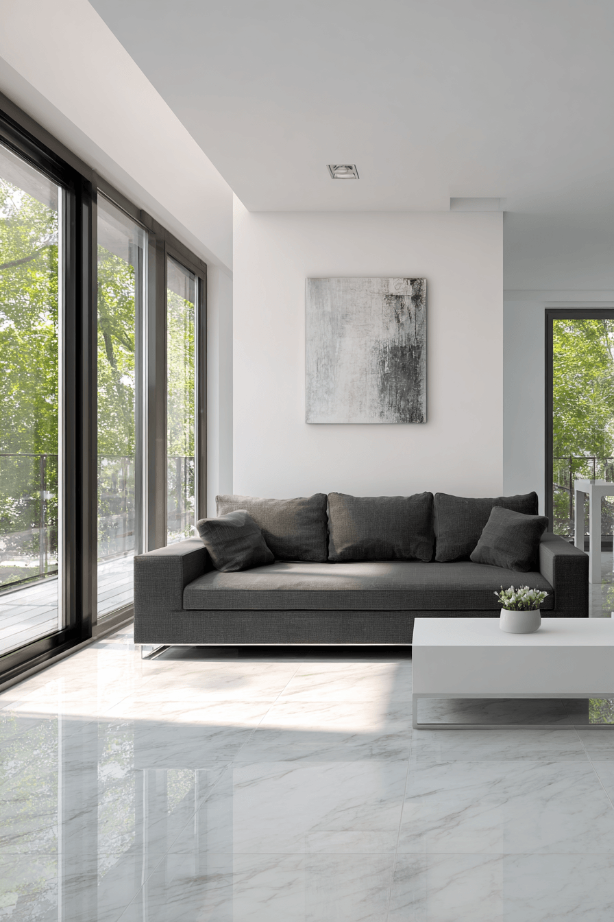 A striking palette of black, white, and grey creates a dramatic look in a dark grey sofa living room designed with monochrome style. The charcoal sofa anchors the space while layers of grey tones add depth and sophistication. Patterns and textures in similar shades prevent the room from feeling flat. Sleek furniture and geometric décor enhance the modern vibe. A monochromatic dark grey sofa living room feels bold, stylish, and effortlessly cohesive. Tap to discover more monochrome living room inspiration.