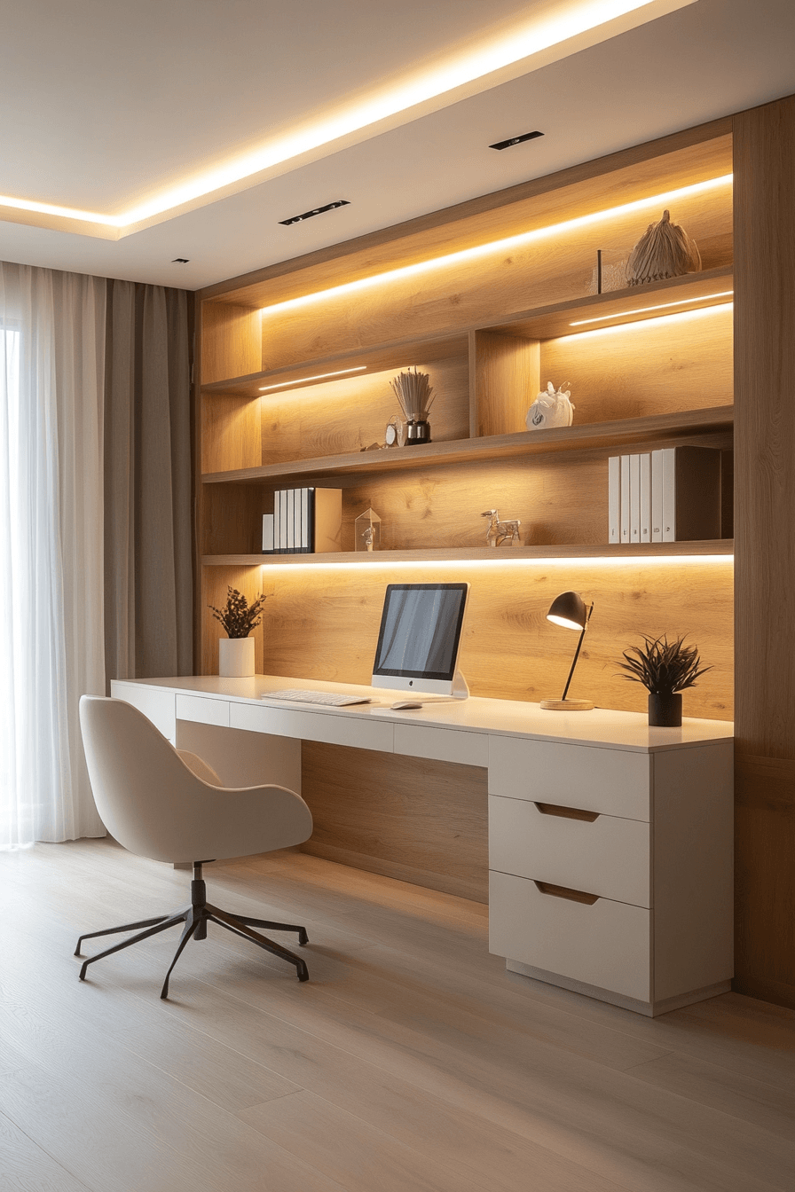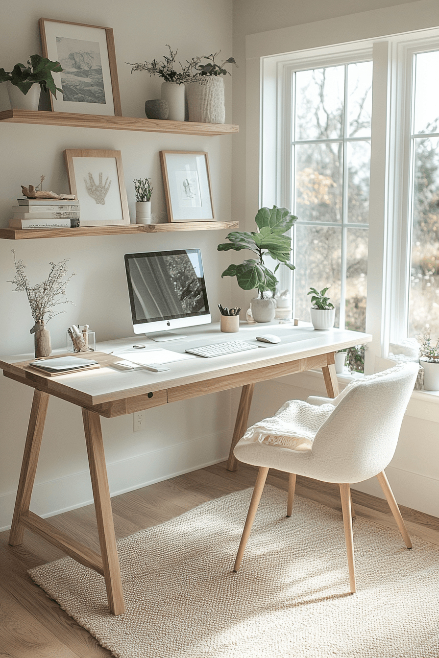 A clean and calming setup can shape an elegant home office that feels both functional and inviting. Light woods, crisp white walls, and simple decor create an open atmosphere that supports focus. The design keeps everything intentional, with no unnecessary clutter to distract from productivity. Comfortable furniture blends style with practicality, making long work sessions more enjoyable. This approach works especially well in smaller spaces where simplicity makes a big impact. Click to discover more Scandinavian-inspired office ideas that maximize both space and style.