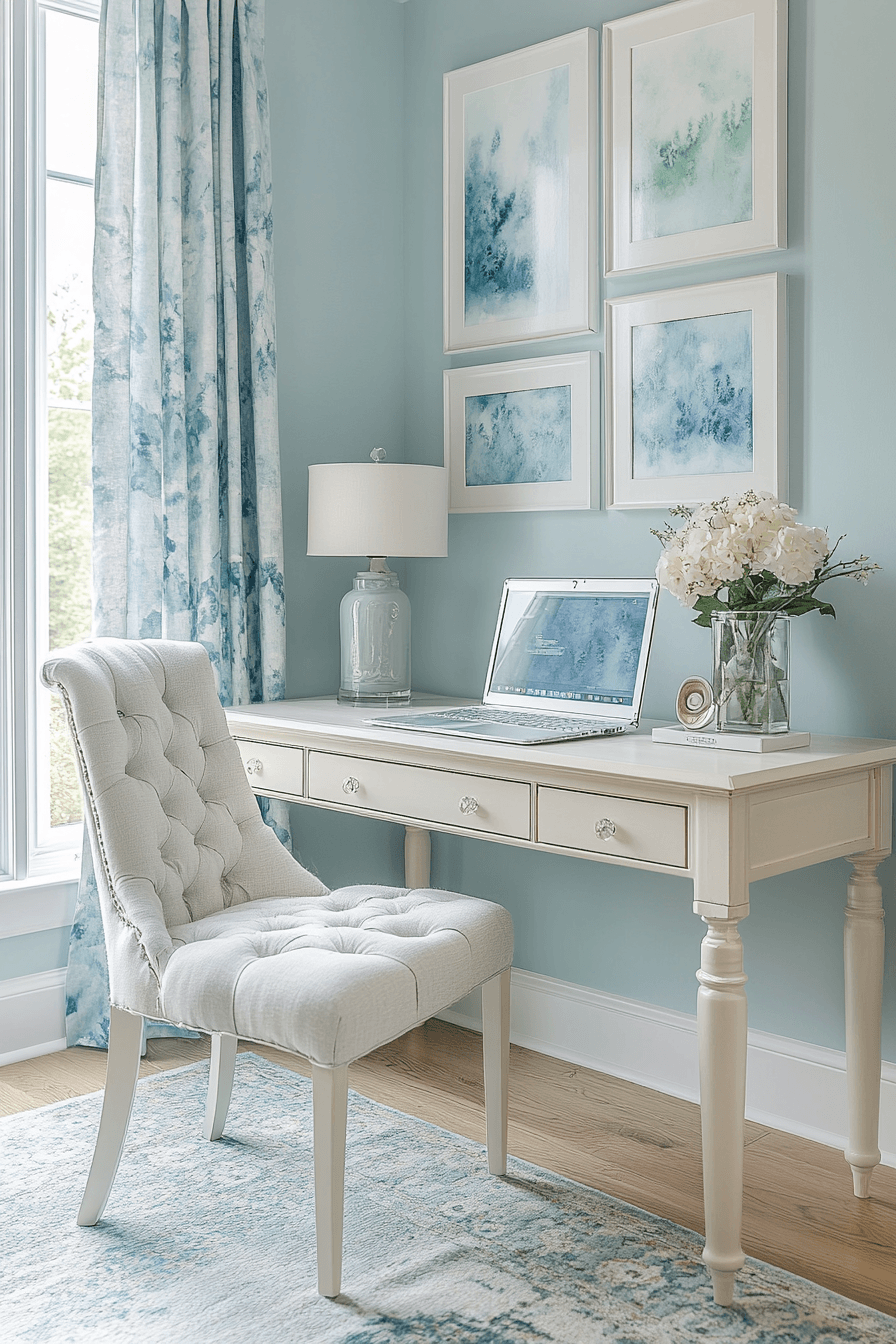 Soft artistic touches can turn any room into an elegant home office that feels peaceful and inspiring. Gentle watercolor tones across the walls or artwork create a soothing backdrop for daily tasks. Light furnishings and airy window treatments help maintain a relaxed, open feel throughout the space. The flowing colors add personality without overwhelming the room’s functionality. This style is perfect for those who want their workspace to feel creative yet calming. Tap to uncover more watercolor-inspired office ideas that spark creativity.