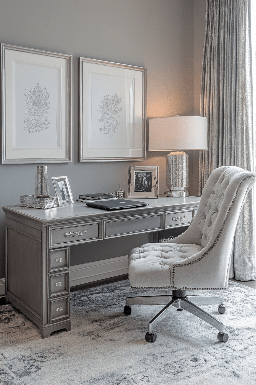 A soft neutral palette can create an elegant home office that feels calm, polished, and effortlessly refined. Gentle gray tones provide a soothing base while silver accents reflect light and add a subtle touch of luxury. Layered textures in fabrics or wall finishes bring depth without overpowering the space. The overall effect is both modern and timeless, making it easy to work in comfort. This design works beautifully for those who prefer understated elegance. Tap to discover more grey and silver office ideas that shine with simplicity.