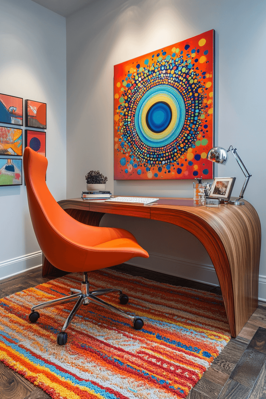 A creative approach can transform your elegant home office into a vibrant and inspiring place to work. Bold artwork and modern furniture introduce personality while keeping the space functional. Pops of color energize the room and help spark new ideas throughout the day. Clean lines ensure the design still feels organized and intentional. This style allows you to express individuality without losing a professional feel. Click to explore more artistic office ideas that bring energy into your workspace.