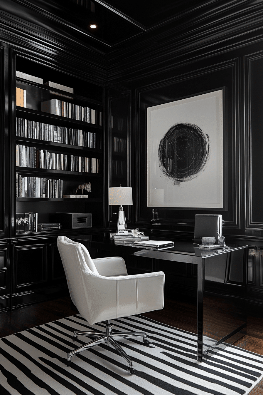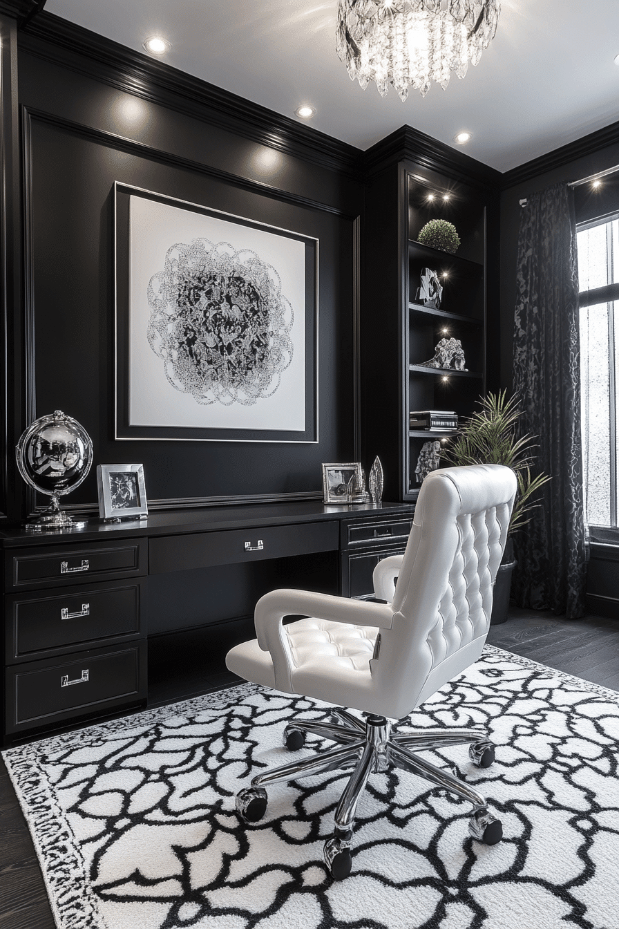 A bold contrast of tones can create an elegant home office that feels both timeless and striking. A black-and-white palette instantly brings sophistication while keeping the overall look clean and polished. Thoughtful details like geometric patterns and high-contrast furniture add depth without overcomplicating the design. Bright walls help the space feel open, while darker accents ground the room with a refined edge. The result is a workspace that feels sharp, confident, and highly functional. Click to explore more monochrome office ideas that deliver effortless style.